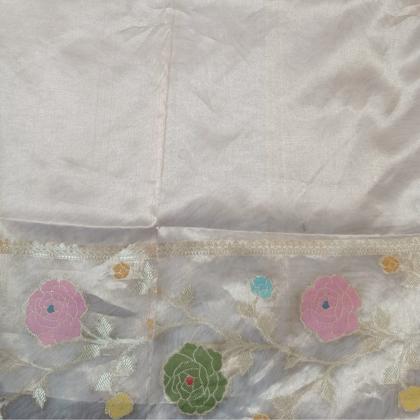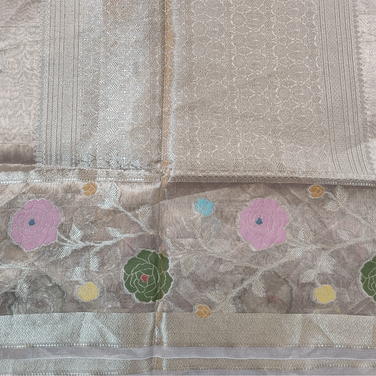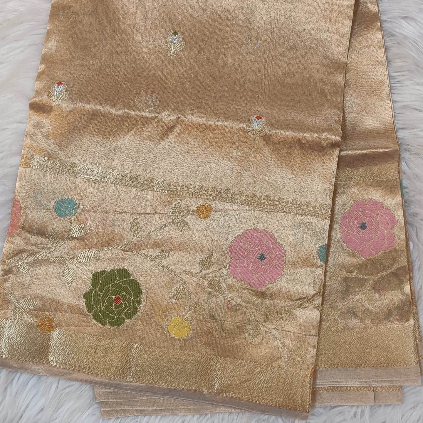 This is a Pure Zari Kota Tissue Saree, a regal ensemble that epitomizes grandeur and delicate craftsmanship. The saree is woven from a high-grade tissue base, featuring a rich, metallic-infused texture that gives the fabric a luminous, radiant sheen. Its lightweight and breathable Kota weave ensures a structured drape while maintaining an airy feel. The body is accented with minimalist, tiny floral buttis that add a touch of sparkle without overwhelming the brilliant, reflective surface of the fabric.