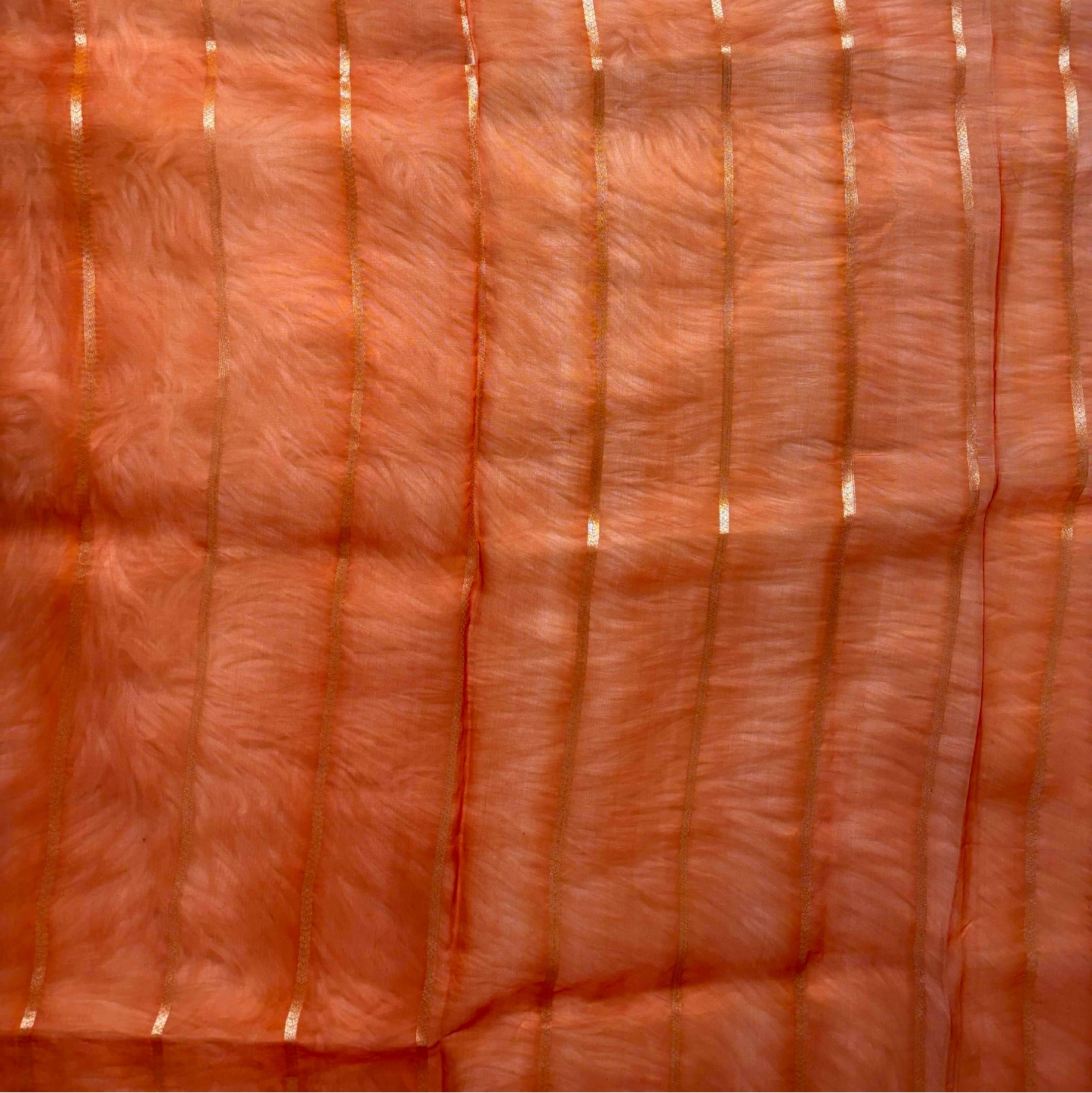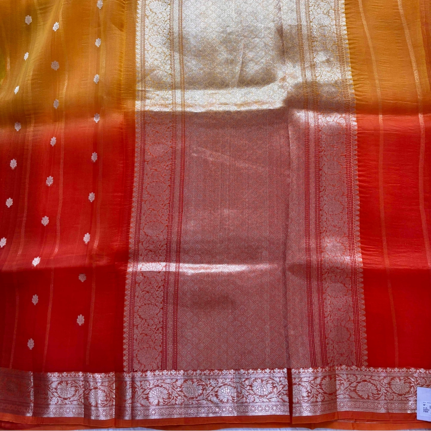 Crafted in airy Kora Organza, this saree features a graceful interplay of soft translucence and structured design. The body is adorned with delicate buta motifs, subtly scattered to create an elegant rhythm, while fine vertical panel lines add a sense of height and fluidity. The pallu is enriched with a contrasting tonal flow and a finely detailed woven border that enhances its overall richness. Lightweight and effortlessly draping, this piece blends classic detailing with a refined contemporary appeal—ideal for festive and elegant occasions.