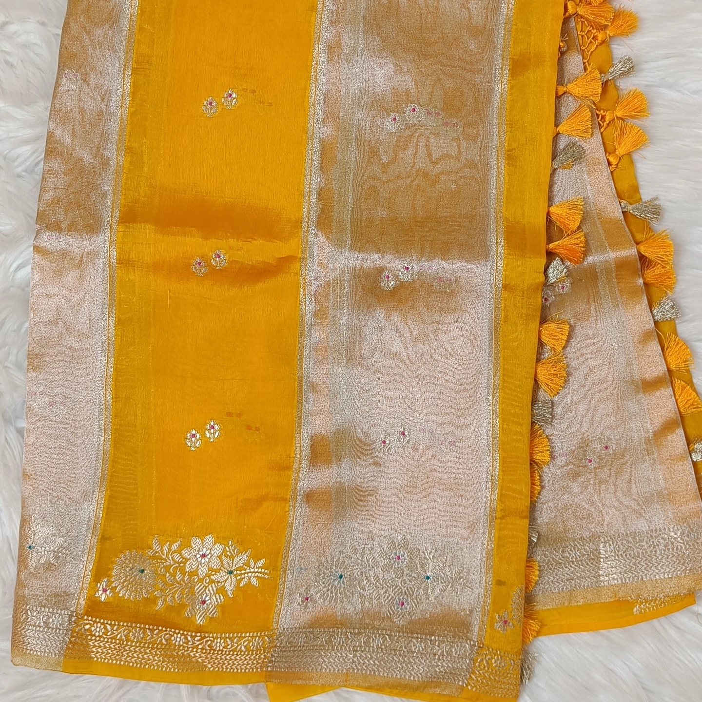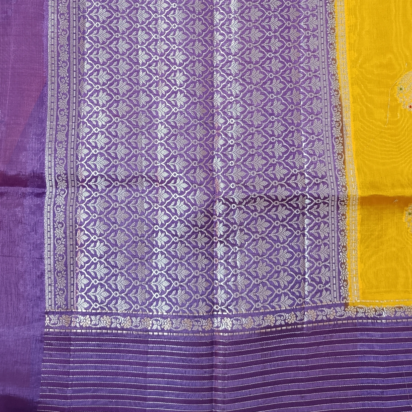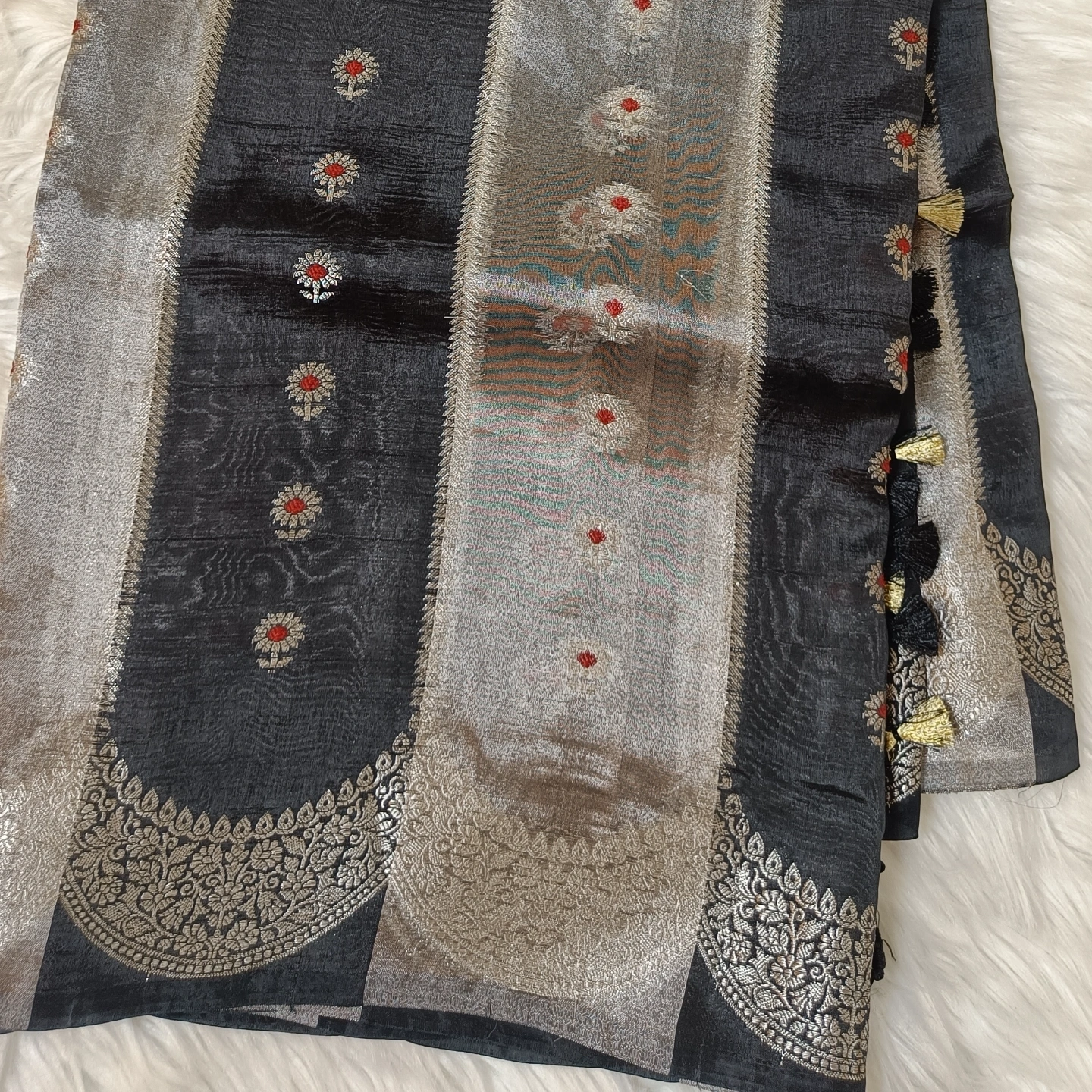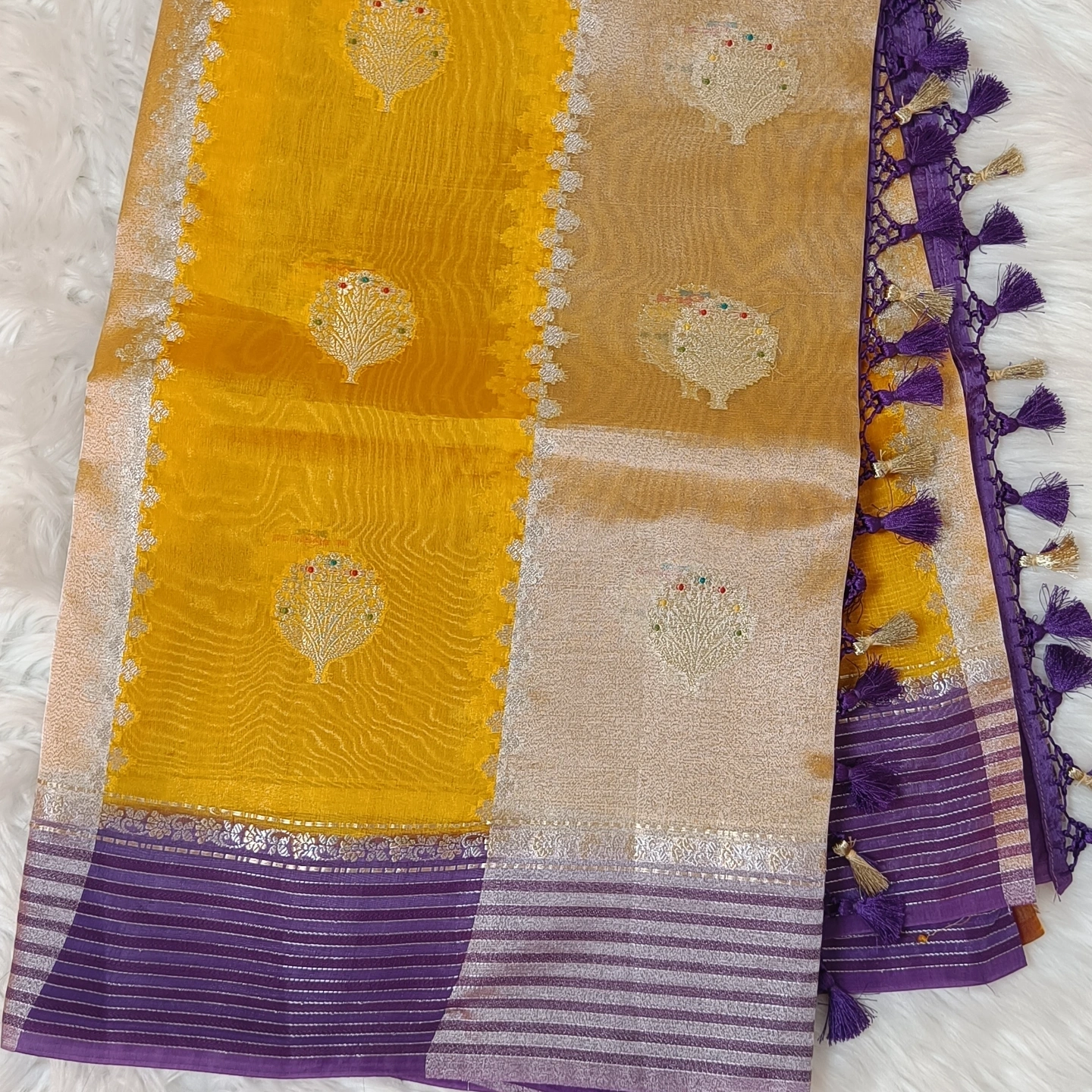 This exquisite saree is crafted from fine Tissue silk, a fabric known for its ethereal translucency and light-catching metallic sheen. It features the complex Rangkat weaving technique, where the textile is divided into distinct, block-like panels of contrasting hues and textures, including shimmering zari-heavy sections. The body is further elevated by intricate tree-of-life or Kalpavriksha motifs, detailed with delicate Meenakari touches that add a jewel-like finish. Finished with a structural striped border and hand-tied tassels, this piece represents a high-art fusion of traditional Banarasi weaving and contemporary geometric aesthetics, offering a voluminous yet weightless drape.