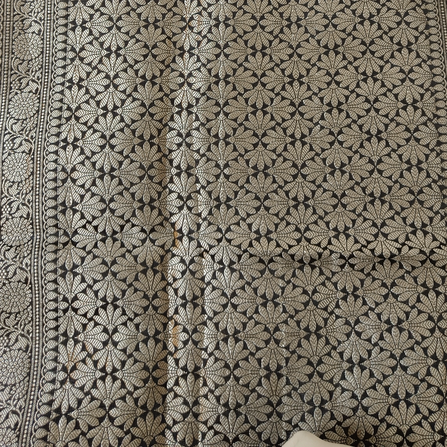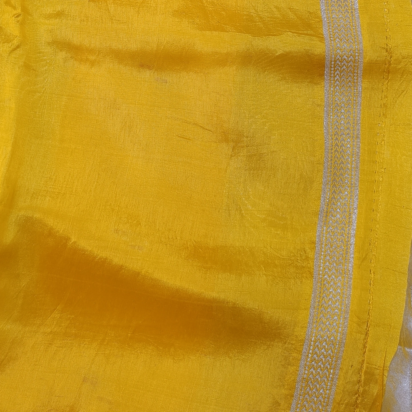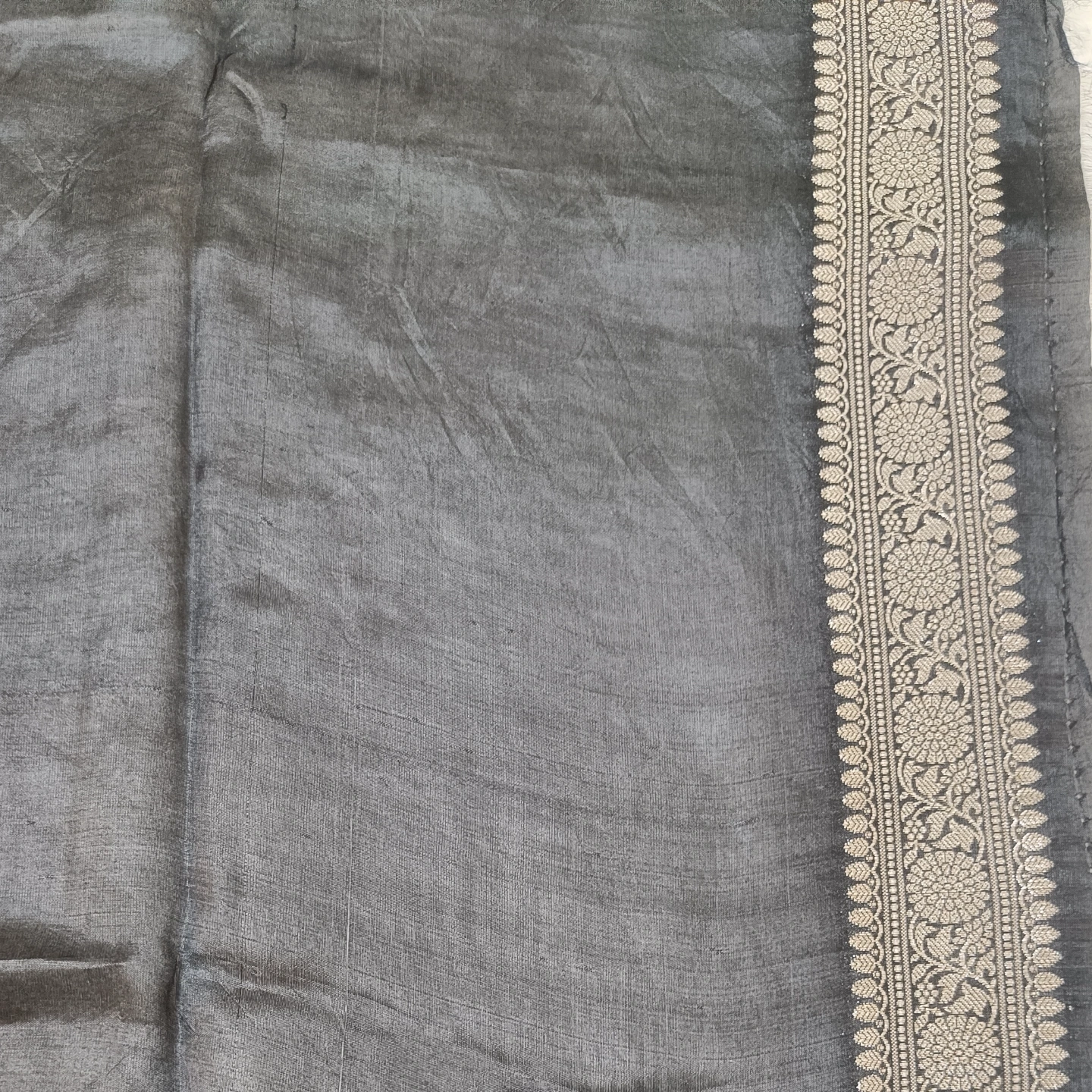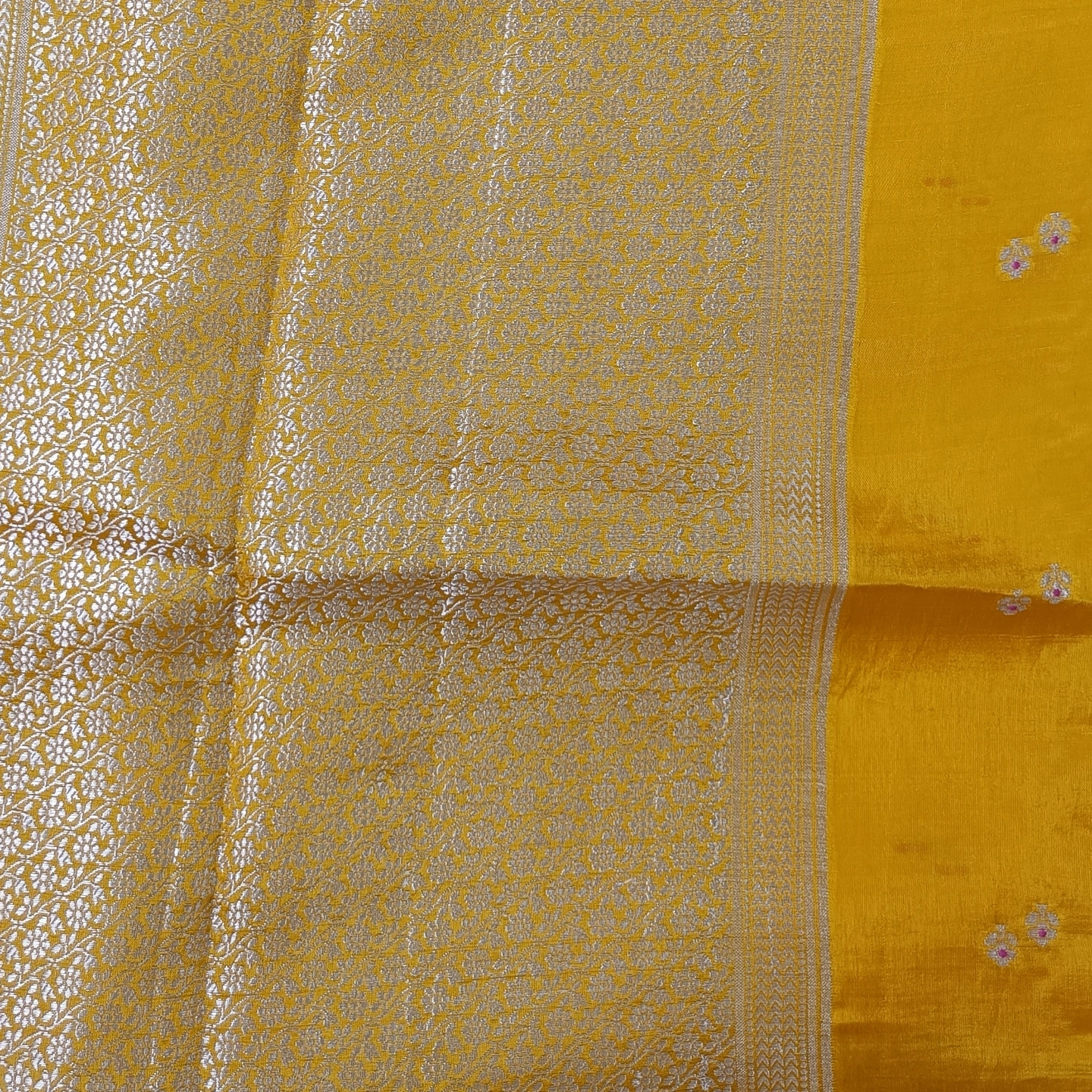 This exquisite saree is crafted from fine Tissue silk, a fabric known for its ethereal translucency and light-catching metallic sheen. It features the complex Rangkat weaving technique, where the textile is divided into distinct, block-like panels of contrasting hues and textures, including shimmering zari-heavy sections. The body is further elevated by intricate tree-of-life or Kalpavriksha motifs, detailed with delicate Meenakari touches that add a jewel-like finish. Finished with a structural striped border and hand-tied tassels, this piece represents a high-art fusion of traditional Banarasi weaving and contemporary geometric aesthetics, offering a voluminous yet weightless drape.