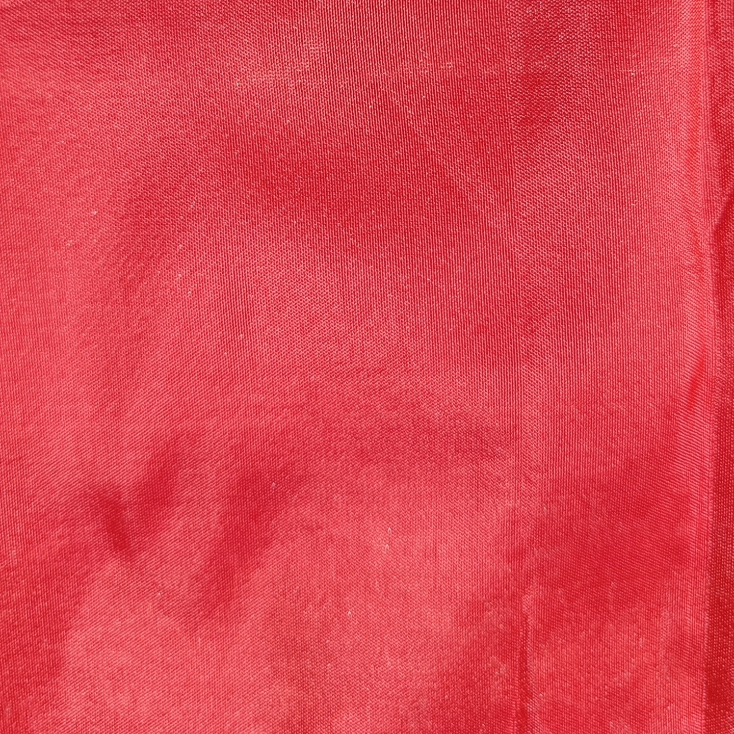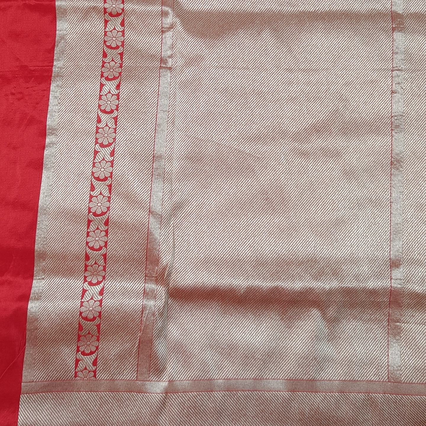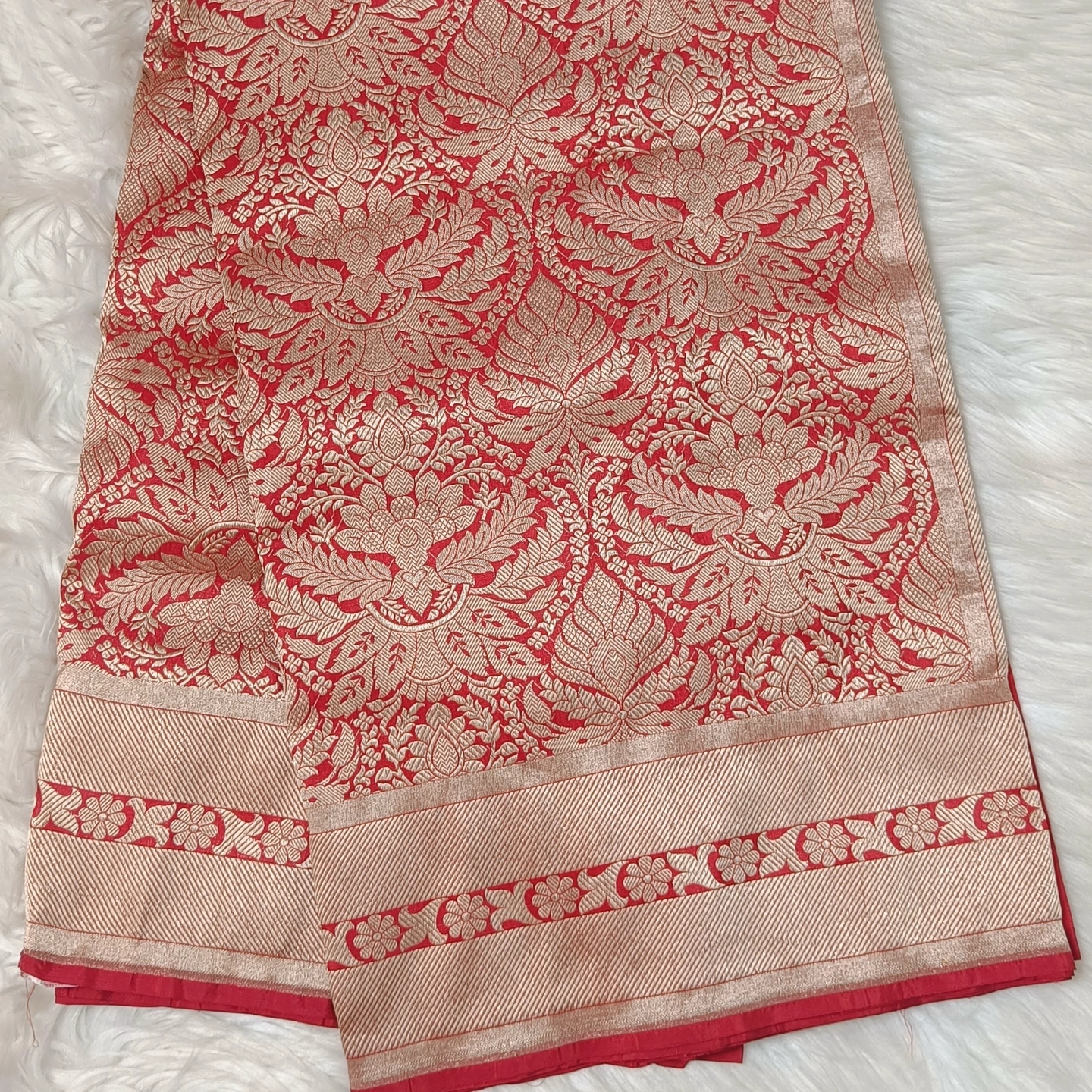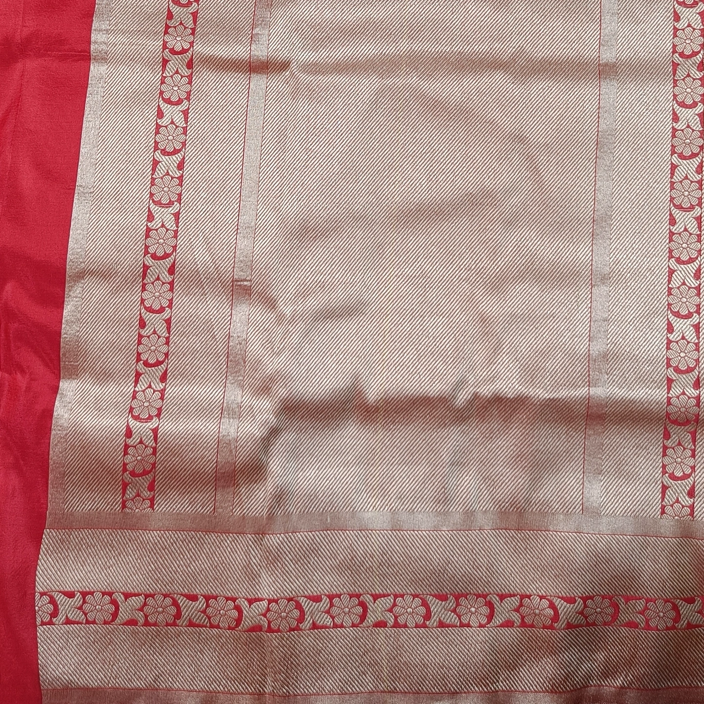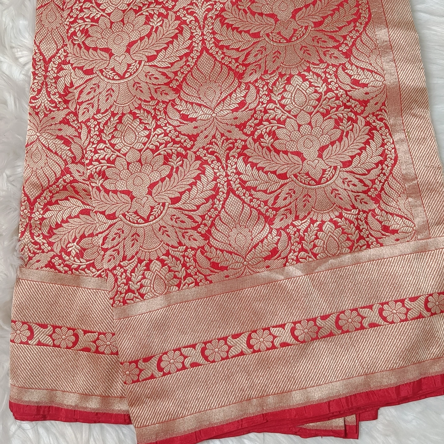 This magnificent textile is a masterpiece of traditional Banarasi weaving, showcasing the opulent beauty of full-body zari brocade. Draped in a classic, celebratory crimson red, the fabric is entirely covered in an intricate Jal (all-over) pattern featuring ornate floral blossoms and scrolling foliate motifs woven in shimmering gold metallic threads. This dense ornamentation creates a rich, textured surface that radiates a royal luster, characteristic of heritage festive wear. The composition is grounded by a wide, sophisticated zari border, which features a combination of fine diagonal stripes and a rhythmic floral band, adding structural elegance to the elaborate body. An quintessential choice for bridal ensembles or grand cultural celebrations, this saree embodies timeless Indian luxury and exceptional artisanal skill.