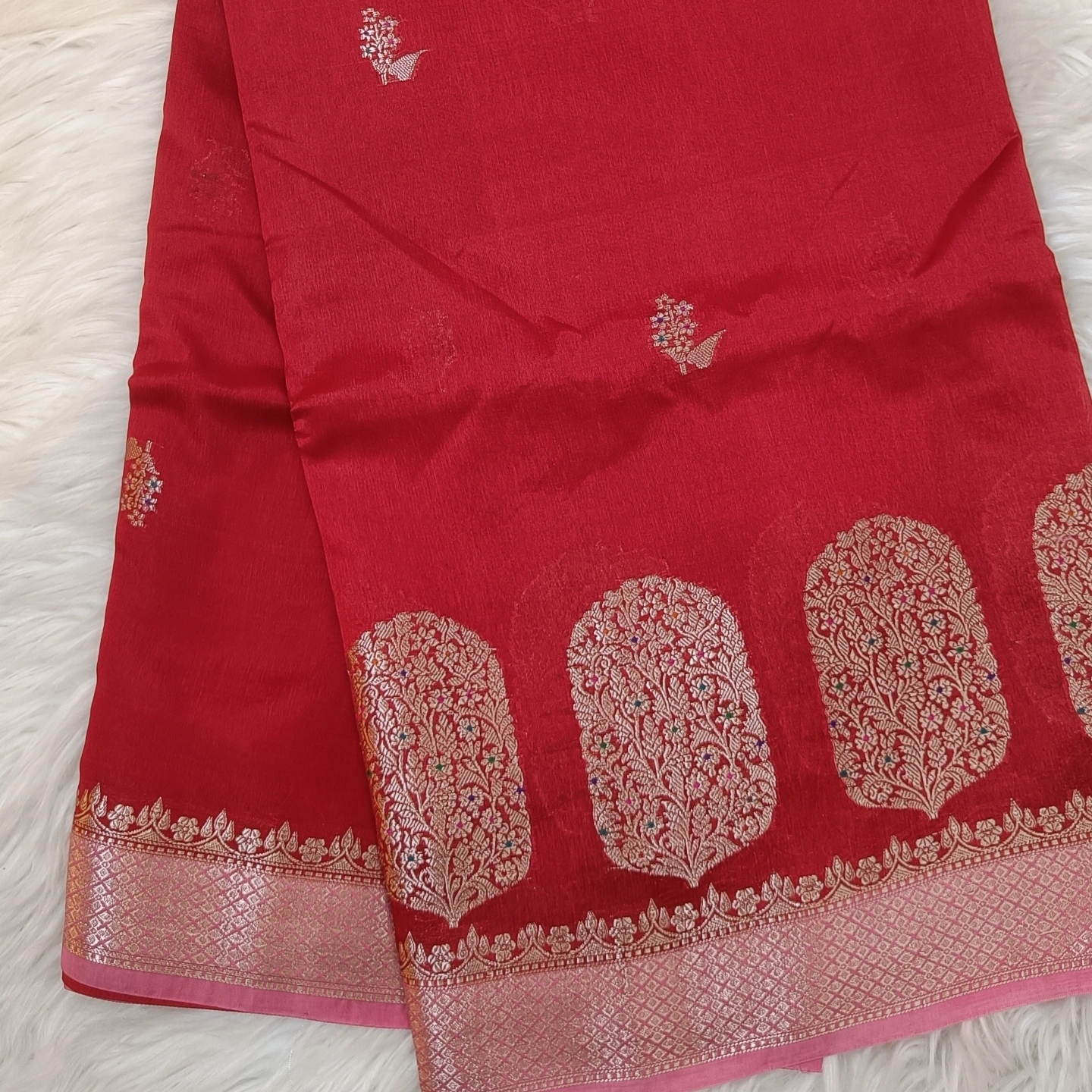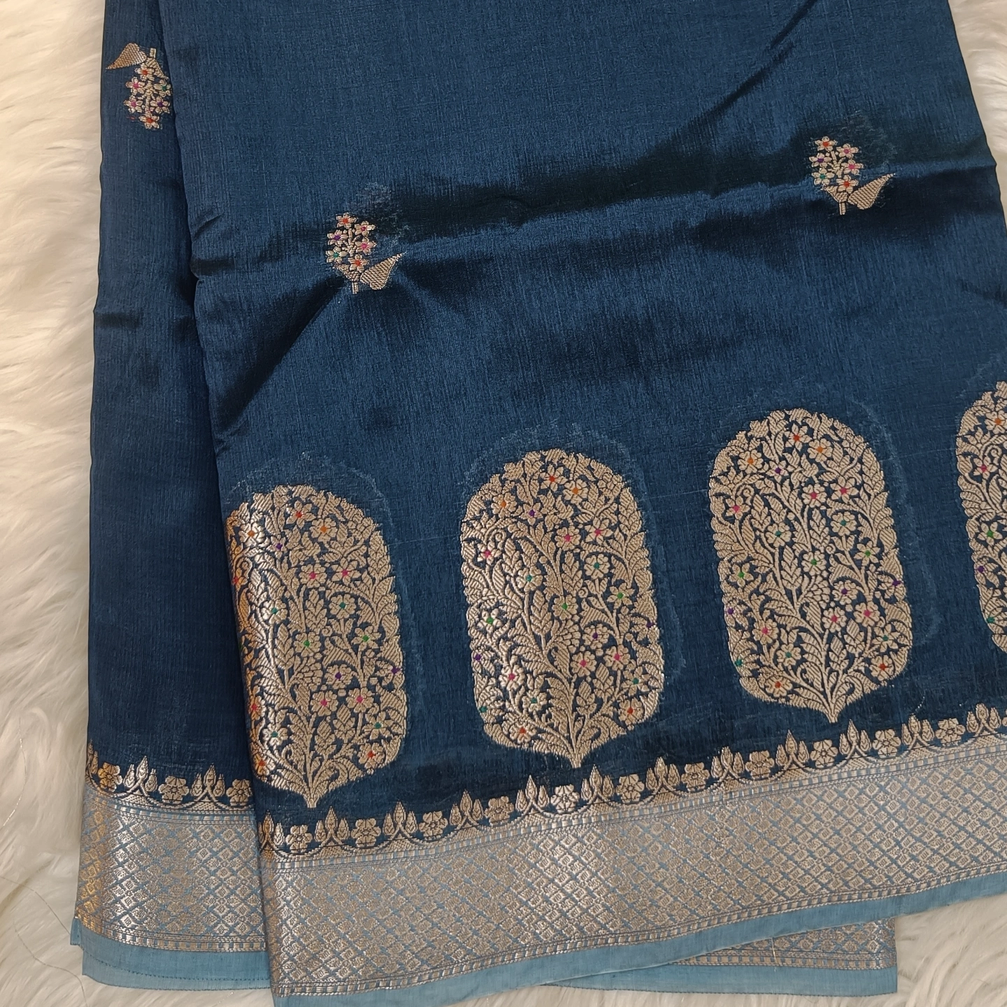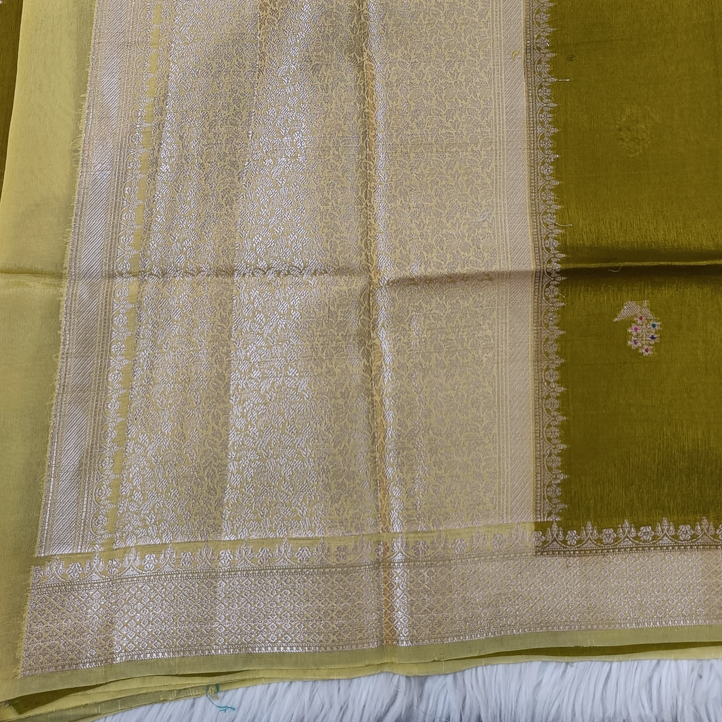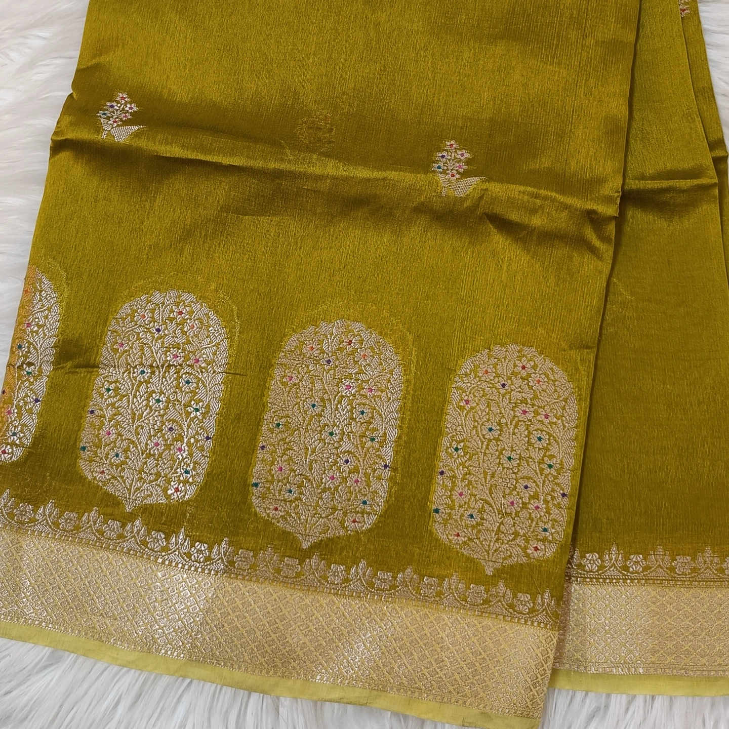 An elegant semi raw mango saree featuring finely woven cylinder-shaped zari buttas along the border, filled with intricate floral detailing. The body is adorned with subtle, delicate motifs that add a refined charm without overwhelming the design. Finished with a rich zari border and soft texture, this saree offers a perfect balance of tradition and sophistication—ideal for festive occasions and graceful evening wear.