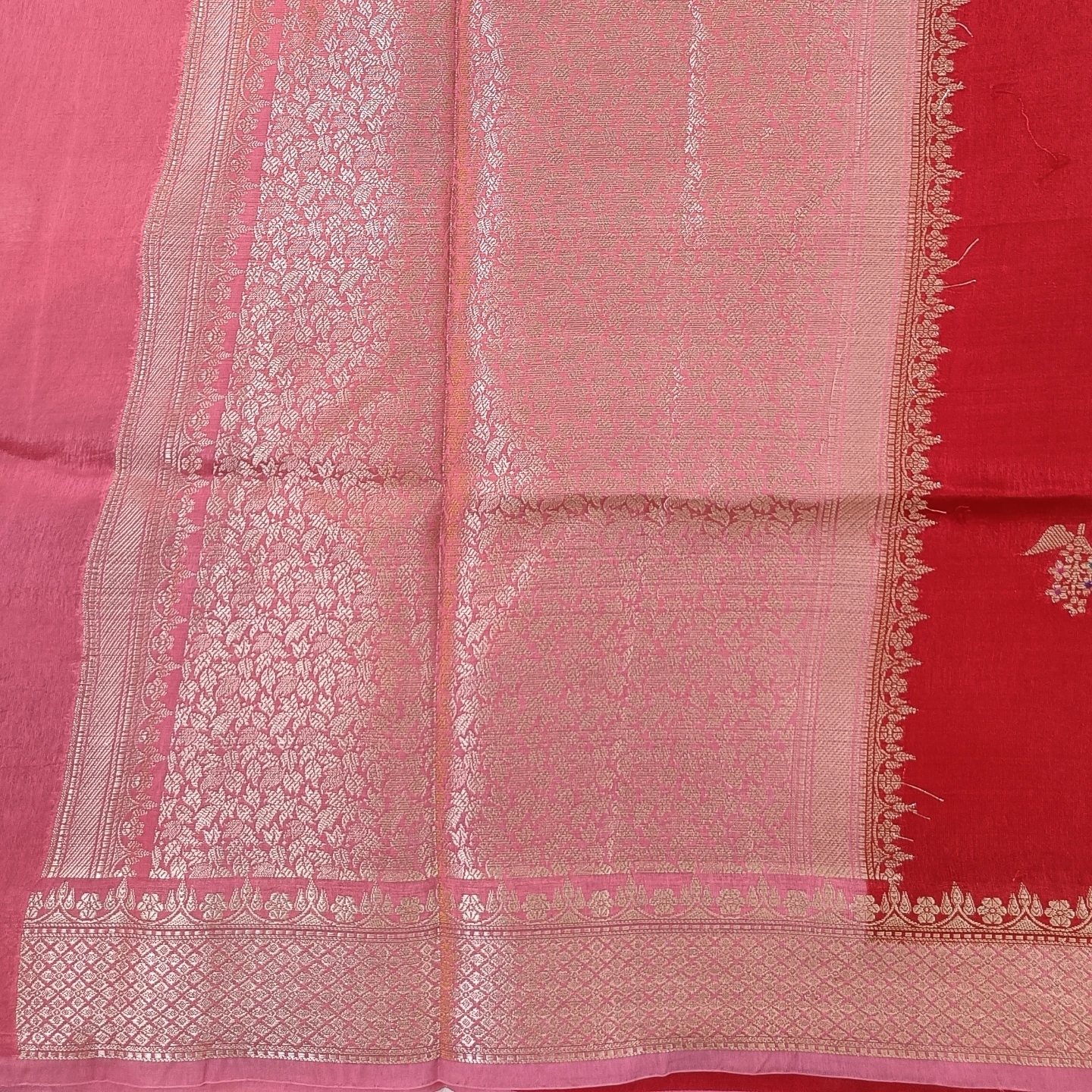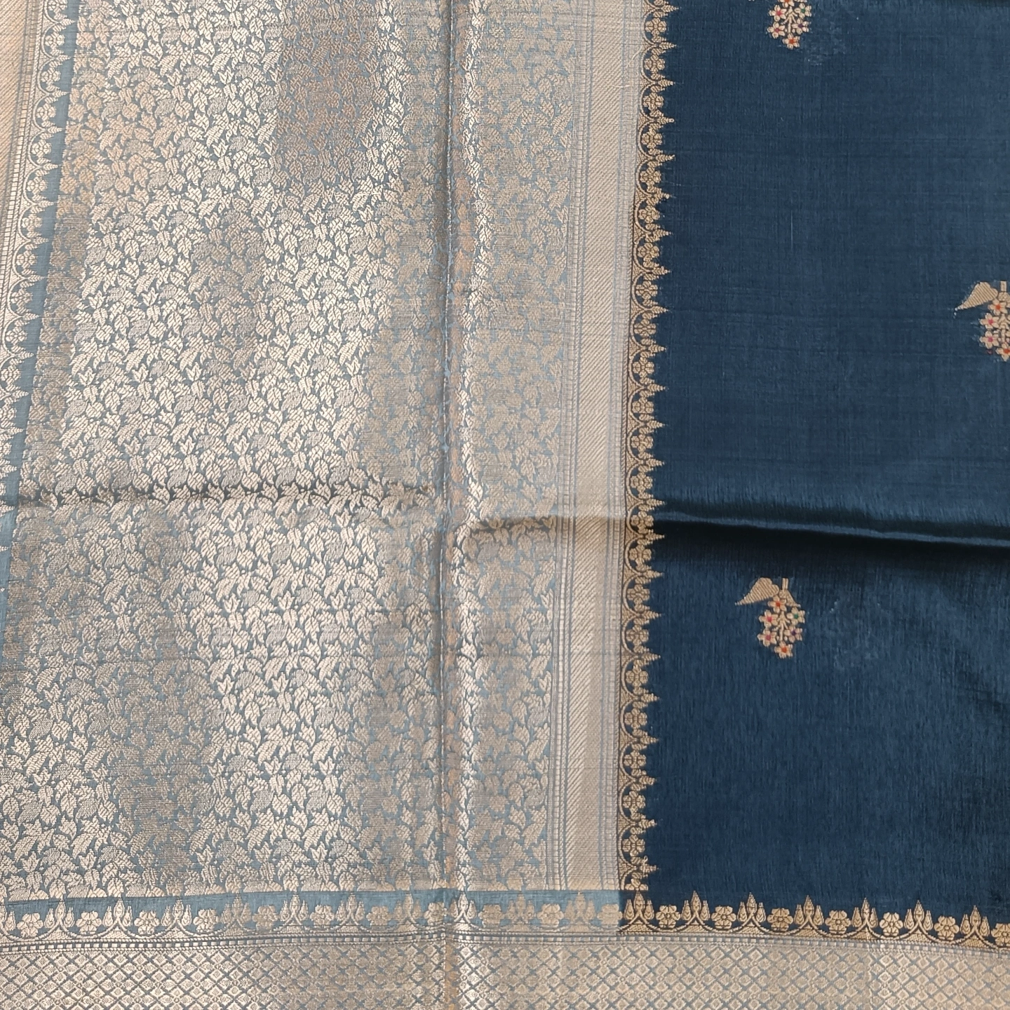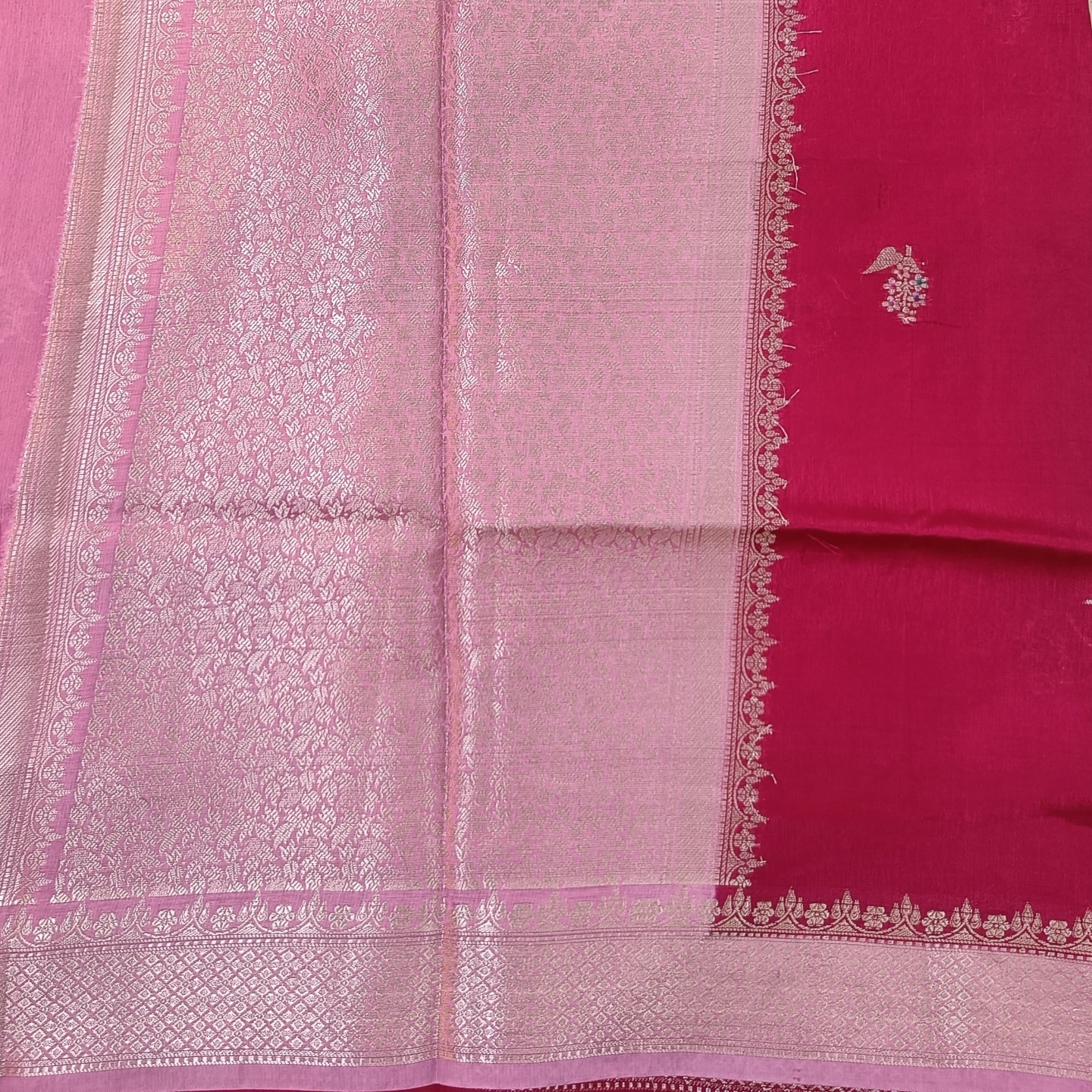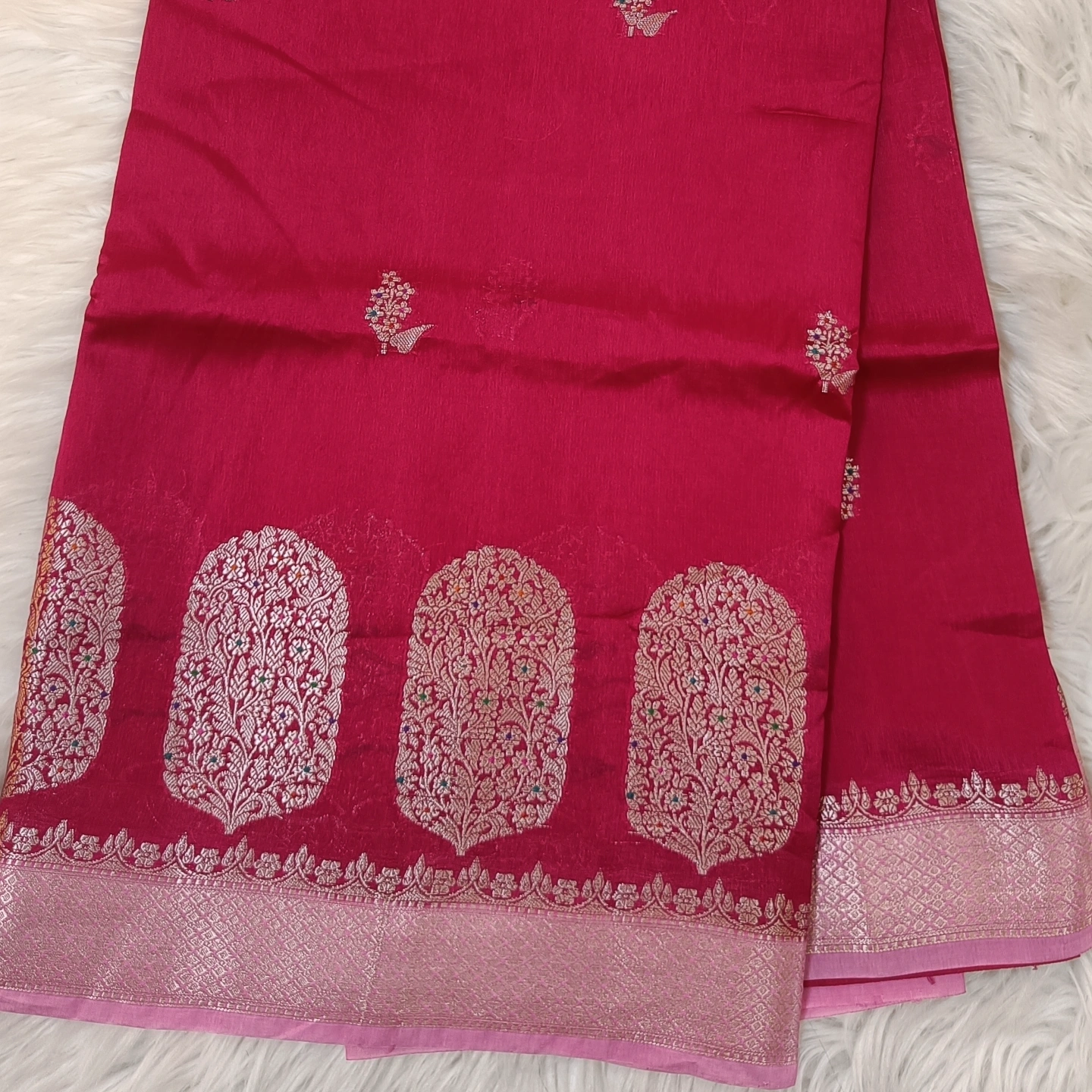 An elegant semi raw mango saree featuring finely woven cylinder-shaped zari buttas along the border, filled with intricate floral detailing. The body is adorned with subtle, delicate motifs that add a refined charm without overwhelming the design. Finished with a rich zari border and soft texture, this saree offers a perfect balance of tradition and sophistication—ideal for festive occasions and graceful evening wear.