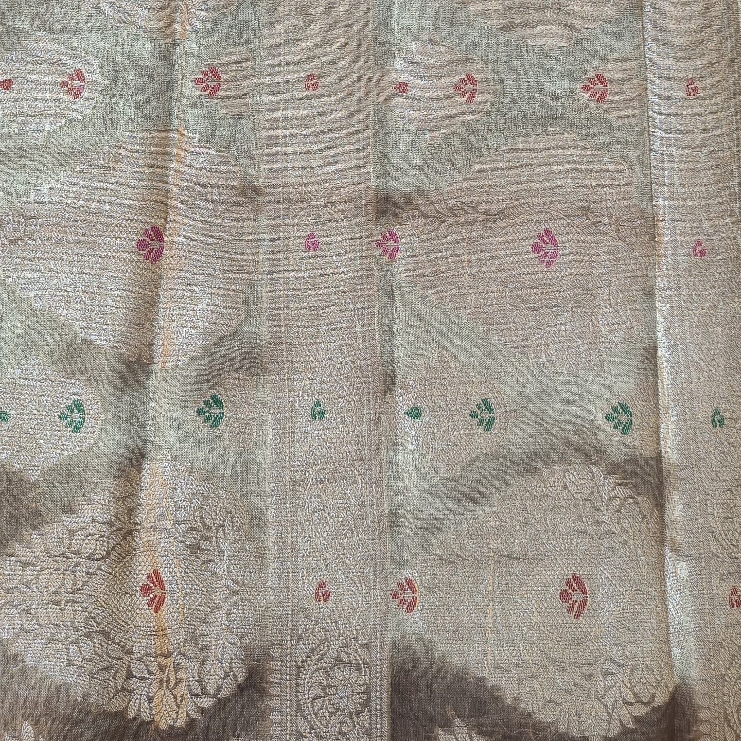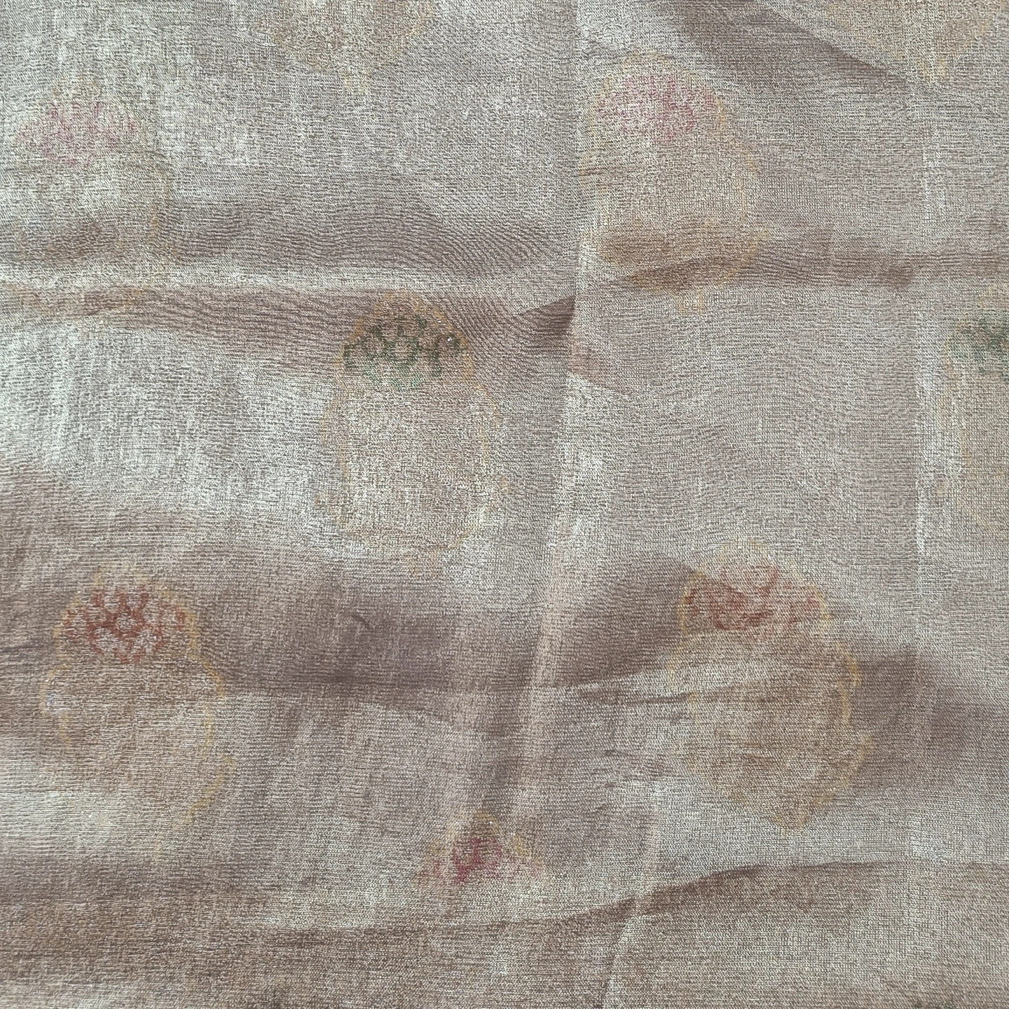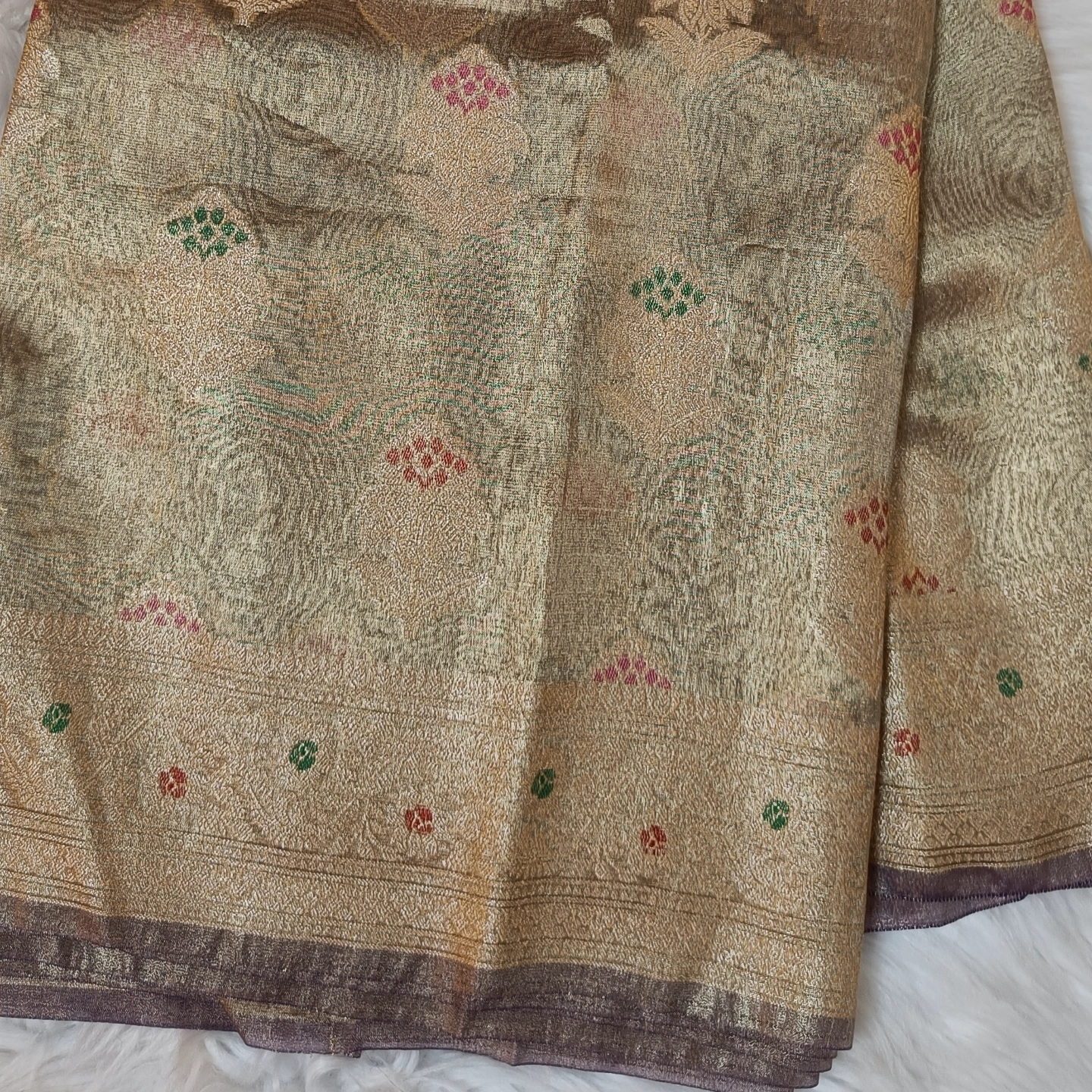 This saree is crafted from a high-quality Semi-Tissue silk blend, offering a characteristic metallic shimmer and a structural drape that holds its shape beautifully. It utilizes the complex Rangkat weaving technique, creating a subtle, multi-tonal effect across the body through varying densities of zari and thread. The textile is further embellished with large, traditional floral motifs that feature delicate Meenakari detailing, adding small pops of jewel-toned texture to the metallic base. Finished with a clean, zari-lined border, this piece combines the luminous quality of tissue with the ornate artistry of classical Indian patterns, making it a striking choice for festive wear.