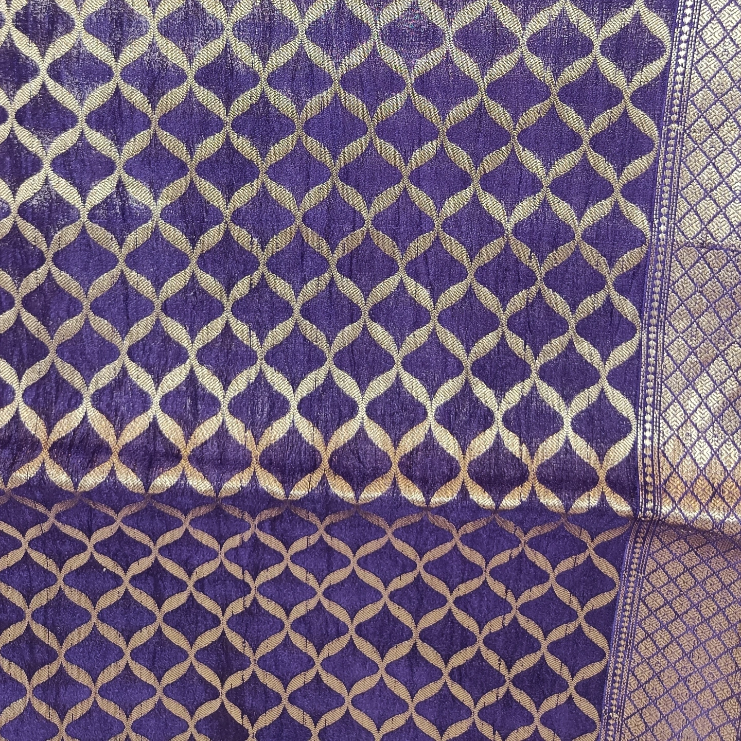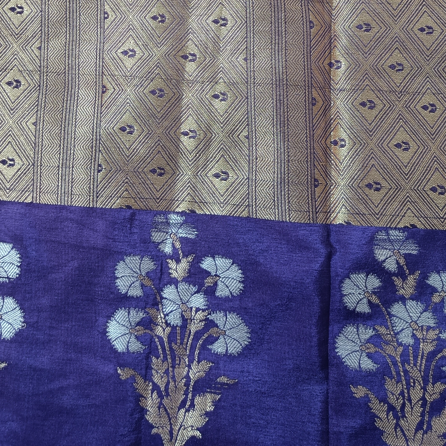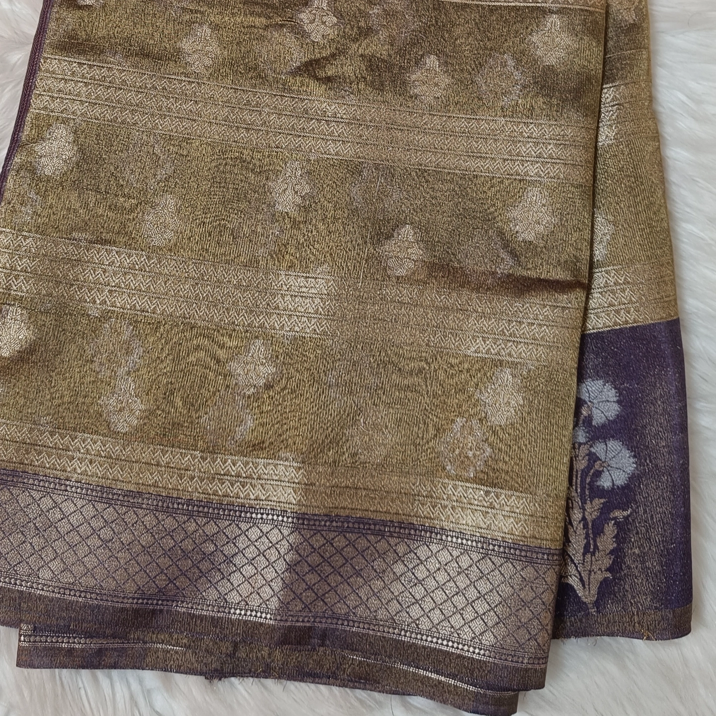 This saree is crafted from a Semi-Tissue base, offering a luminous, metallic sheen and a lightweight, structured drape that retains its silhouette beautifully. The body features a subtle horizontal orientation, accented by repeating geometric and floral motifs woven directly into the fabric using fine zari. It is highlighted by a traditional Ganga-Jamuna border effect, where contrasting zari tones and intricate patterns create a multi-dimensional look. The pallu is further detailed with large floral sprigs and geometric bands, blending the opulent aesthetic of classical Banarasi weaving with the efficiency of a powerloom for a contemporary, durable finish.