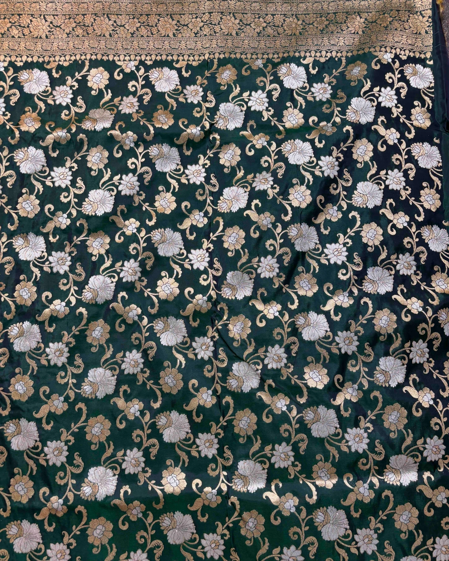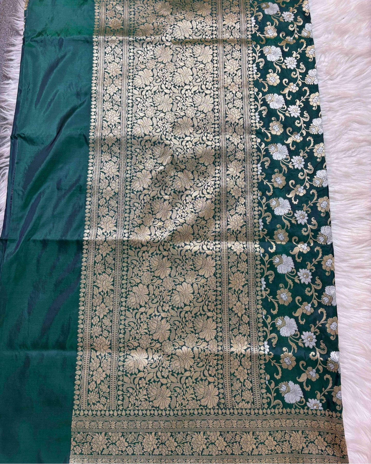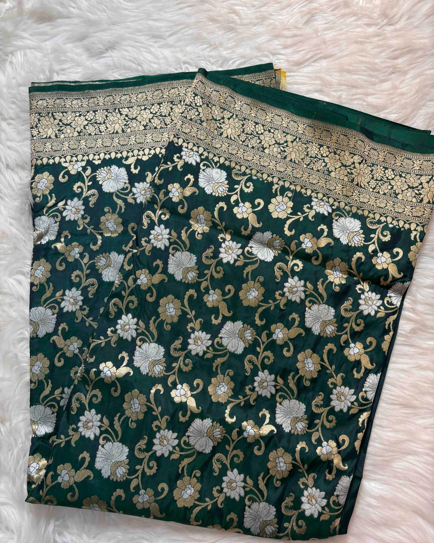 Woven in luxurious pure Katan silk, this saree is a timeless expression of regal craftsmanship and elegance. The body features an all-over floral jaal, intricately woven with rich zari and enhanced with delicate Meenakari detailing that adds depth and artistic vibrance to every motif. The finely crafted border complements the design with traditional patterns, lending a grand and structured finish. With its smooth texture, rich weave, and opulent detailing, this saree is a perfect choice for weddings, festive celebrations, and statement occasions.