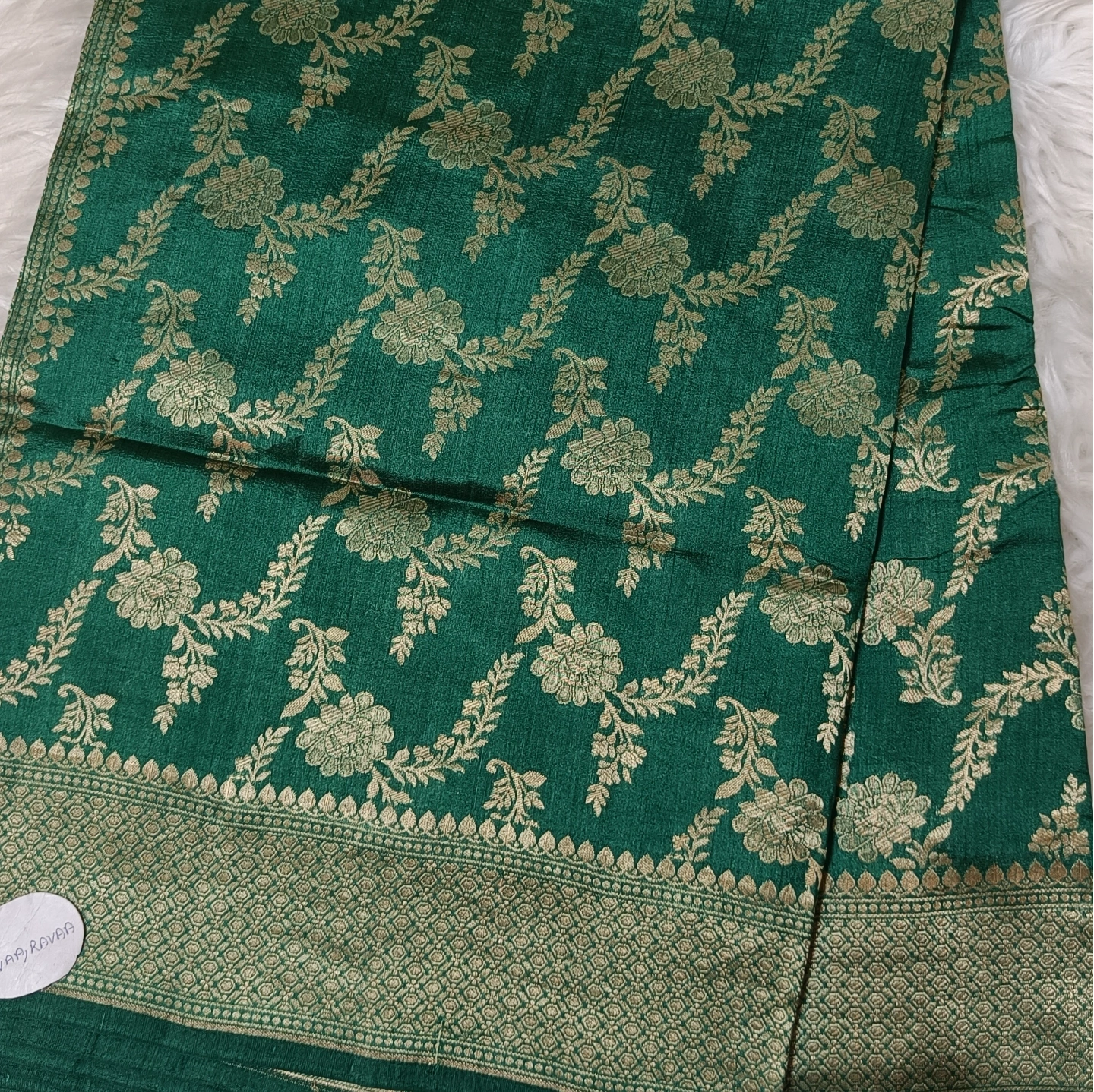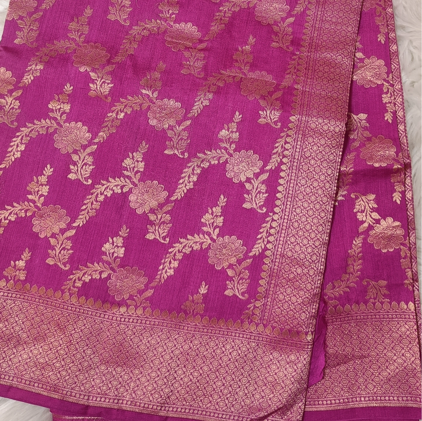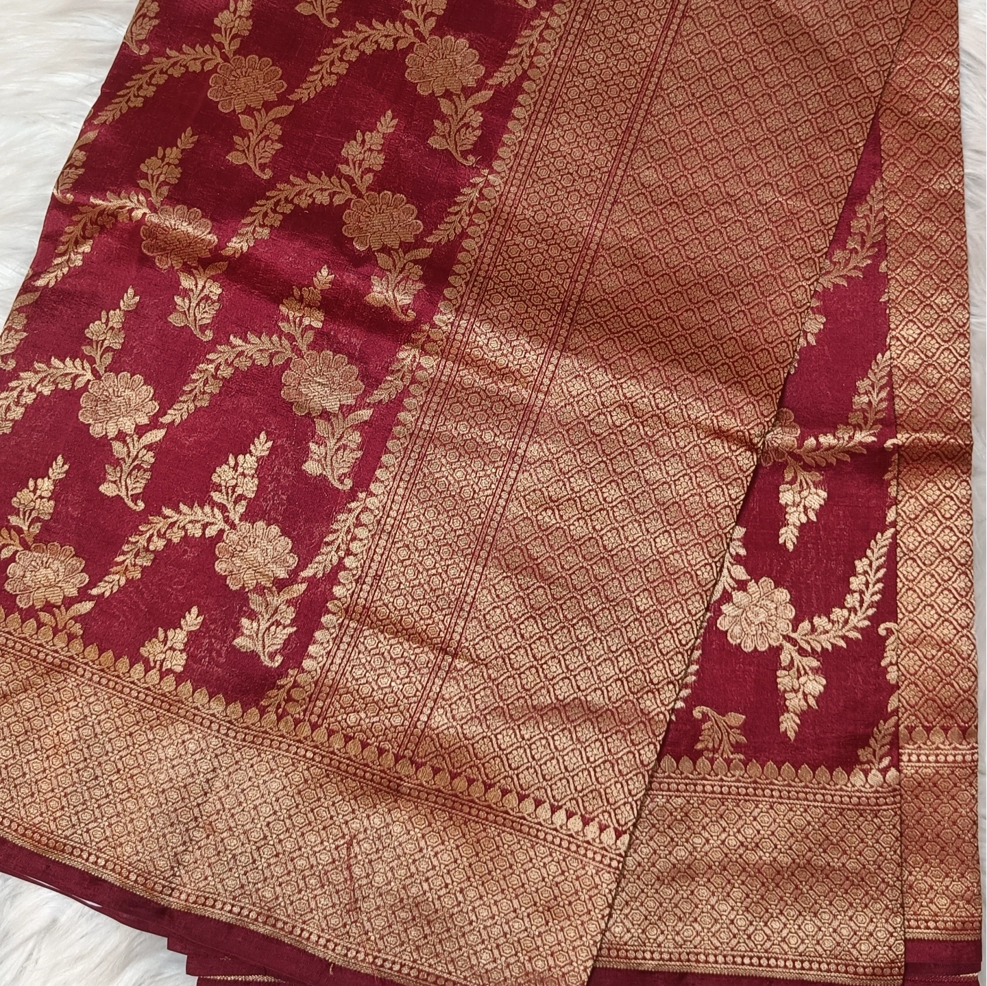 Woven in fine chiniya silk, this saree features an exquisite all-over floral jaal pattern highlighted with intricate zari work. The richly detailed pallu and densely woven border add depth and grandeur, while the delicate butti-style motifs enhance its traditional charm. With its soft texture and graceful drape, this saree is a perfect blend of heritage craftsmanship and refined elegance, ideal for festive and celebratory occasions.