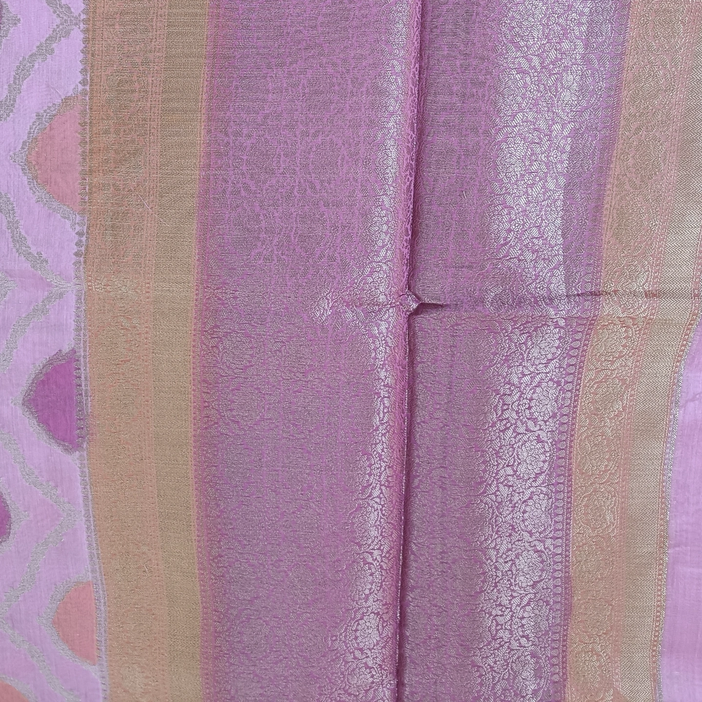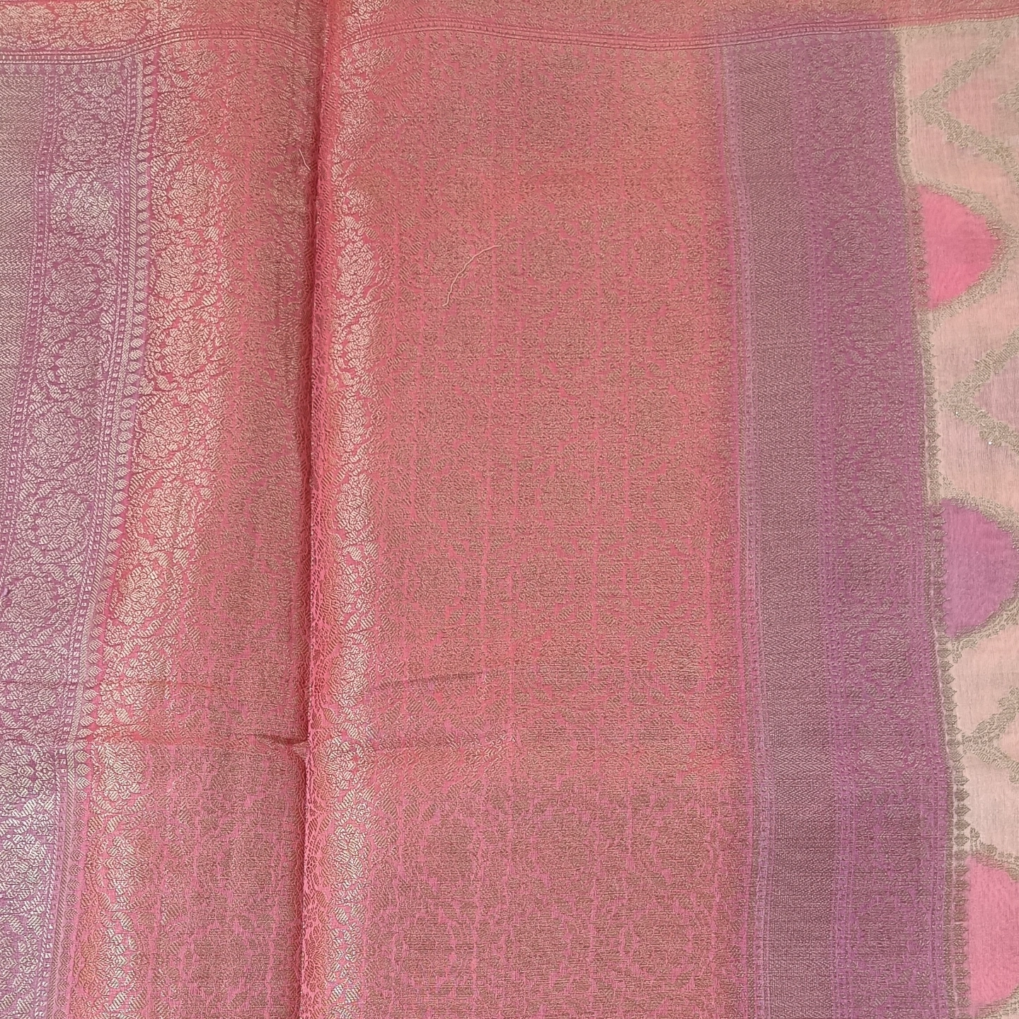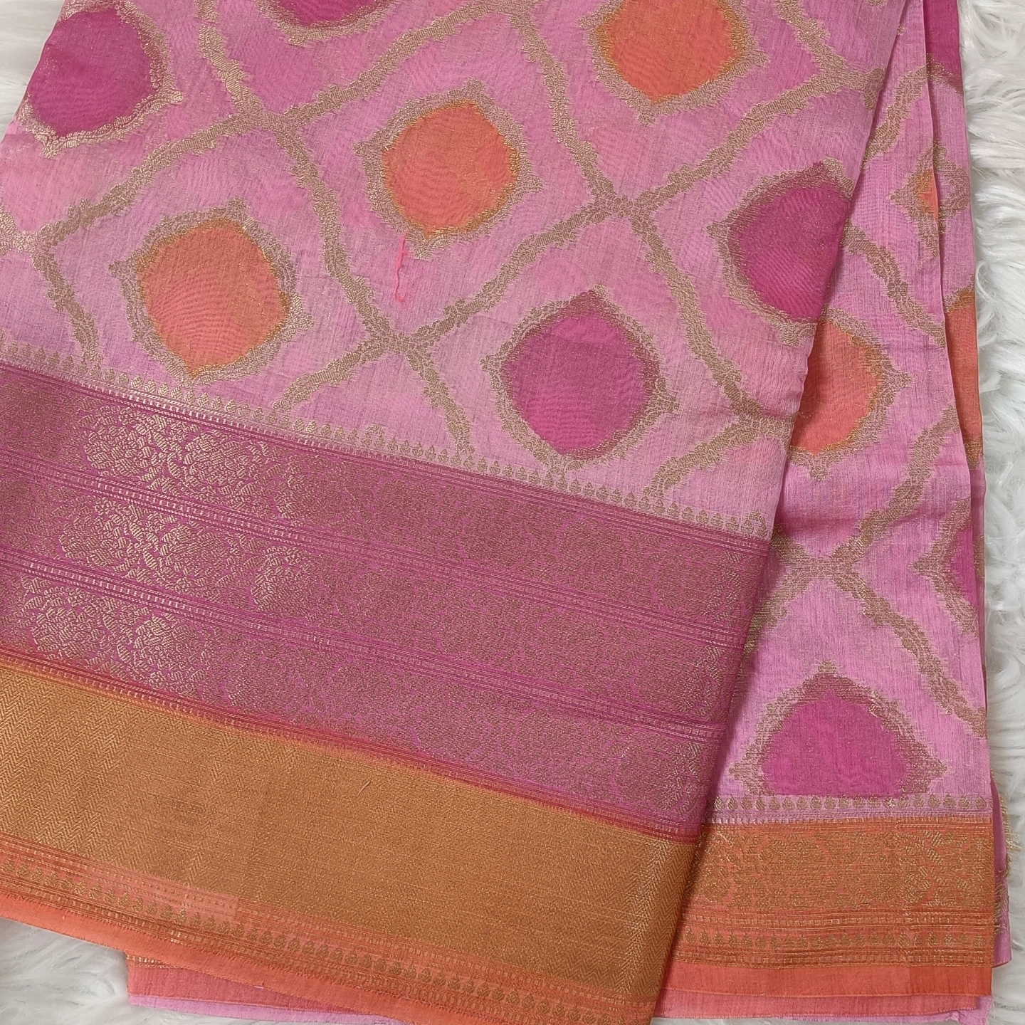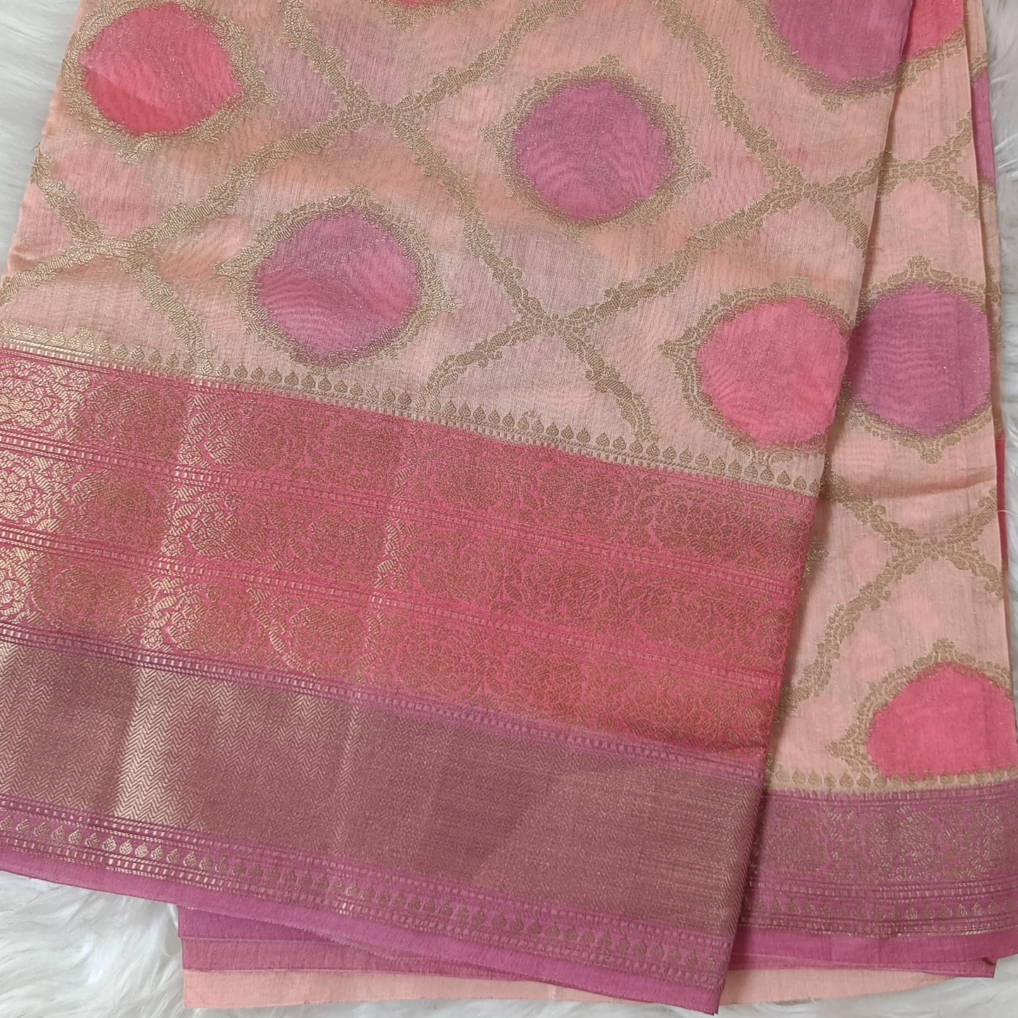 A graceful Chanderi saree in soft peach tones featuring vibrant rangkat-style circular buttas in shades of pink, highlighted with delicate gold zari lattice work. Finished with a rich pink zari border, this lightweight saree blends traditional elegance with a contemporary color palette, perfect for festive and semi-formal occasions.