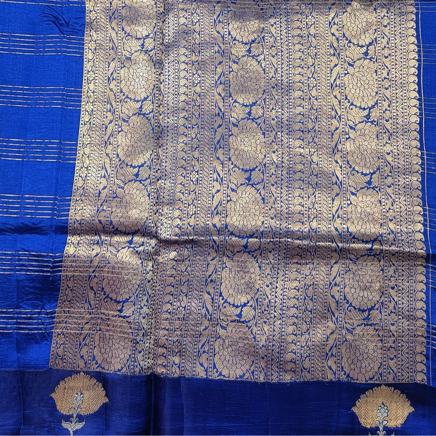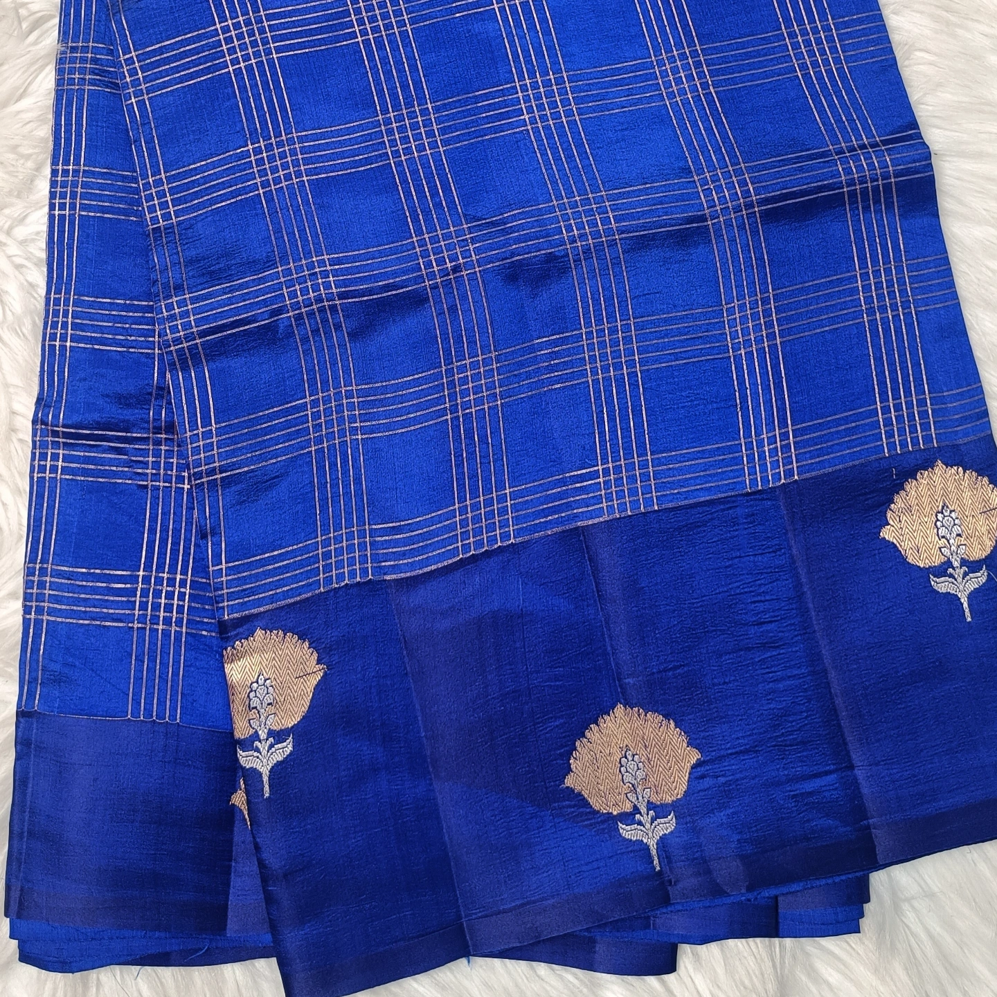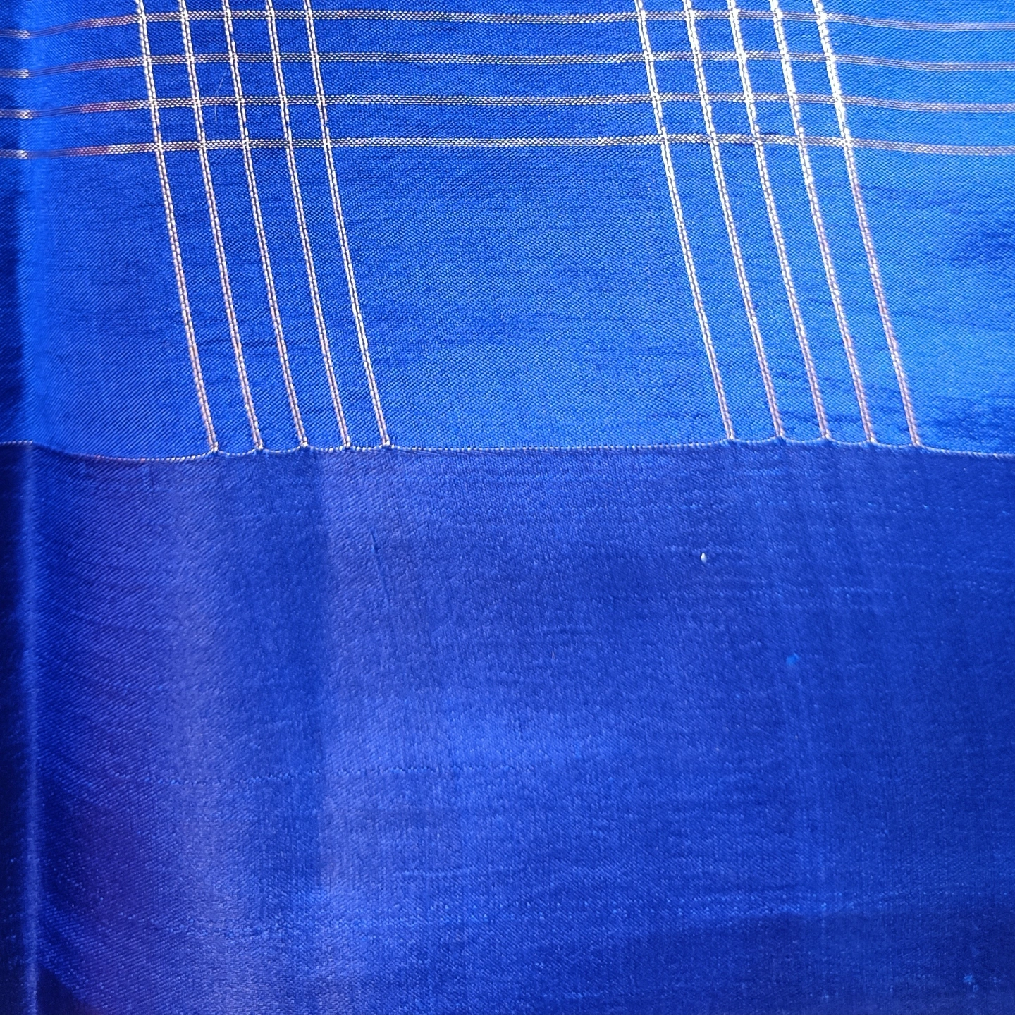 This masterfully woven fabric presents a harmonious blend of geometric precision and traditional floral artistry. Crafted from high-quality Silk Katan, the body features a vibrant cobalt blue base embellished with a fine, gold-toned checkered pattern that lends a structured, contemporary feel to the textile. The composition is grounded by a luxurious, wide satin border in a slightly deeper tonal blue, which provides a smooth, lustrous contrast to the textured body. Adorning the border are classic Raw Mango-style floral motifs, meticulously woven in metallic zari to create a focal point of timeless elegance. The interplay between the crisp linear grid and the organic, ornate border makes this fabric an ideal choice for creating sophisticated sarees or statement ethnic wear that balances modern geometry with heritage charm.