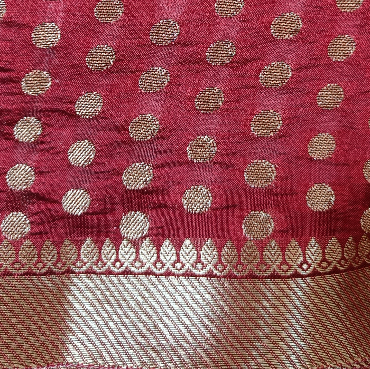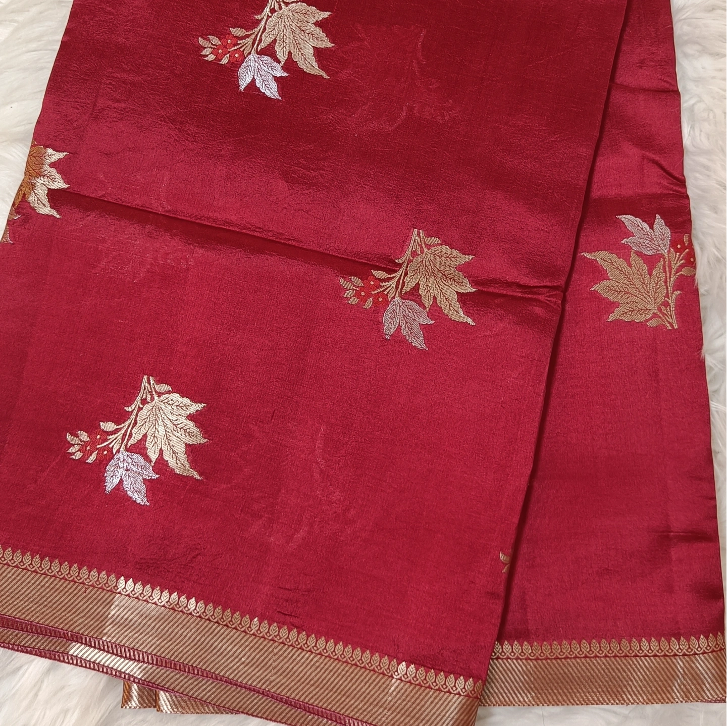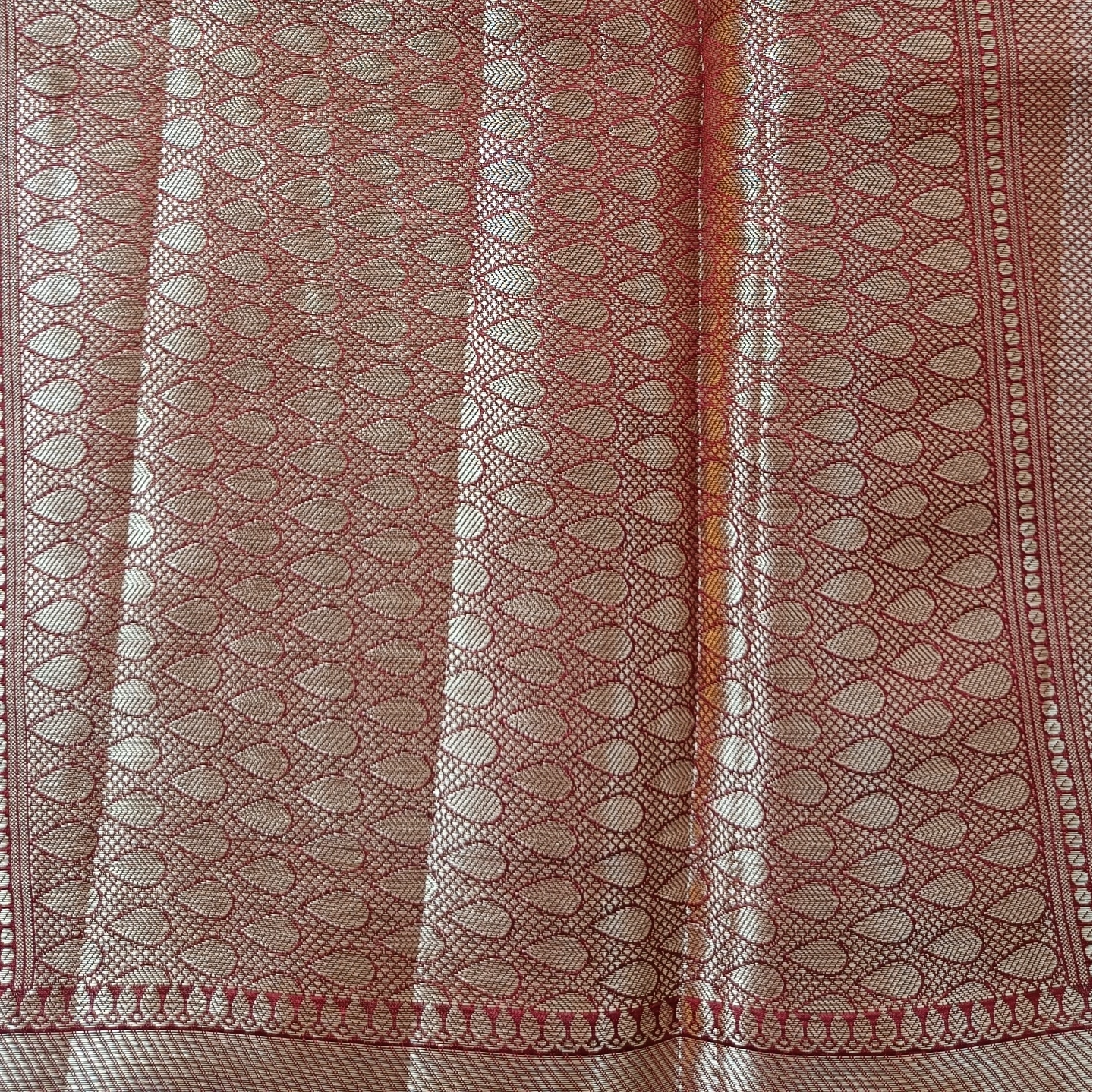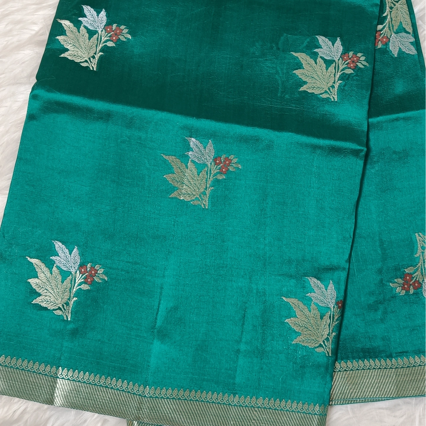 Woven in rich katan silk, this saree showcases elegant meena butti motifs inspired by raw mango designs, delicately placed across the body. The smooth, lustrous texture enhances the intricate zari work, while the finely detailed border adds a touch of traditional sophistication. With its graceful fall and timeless weaving artistry, this saree is a perfect expression of classic heritage blended with subtle vibrance.
