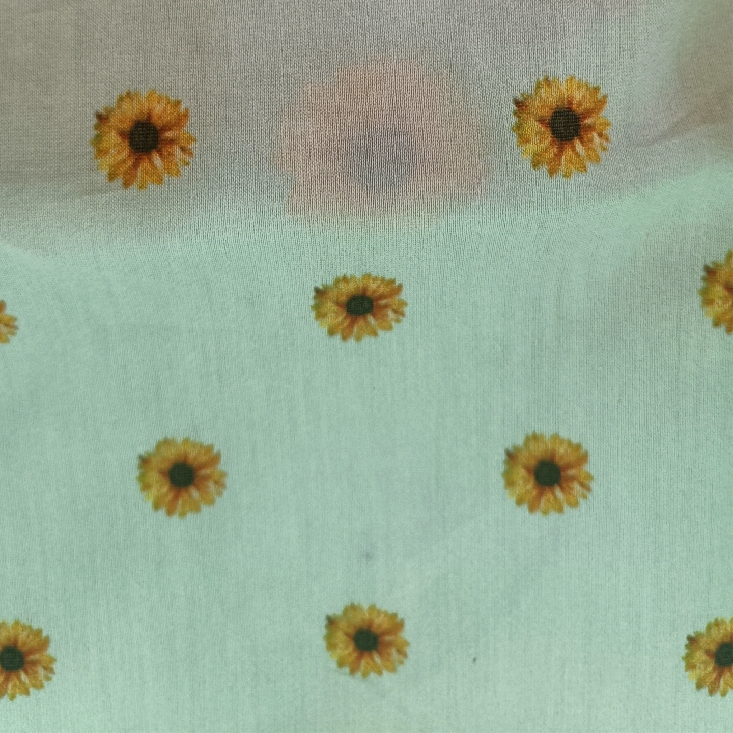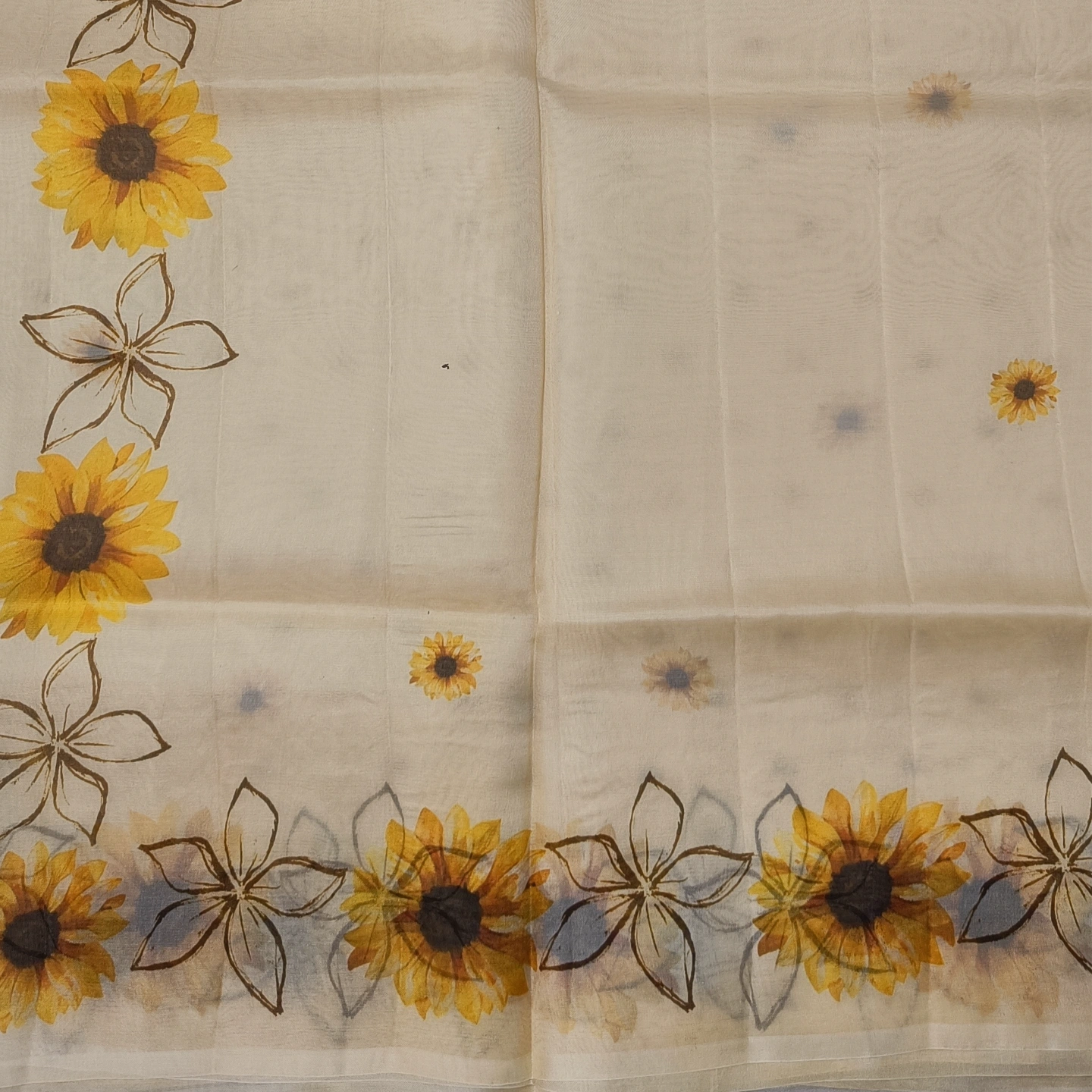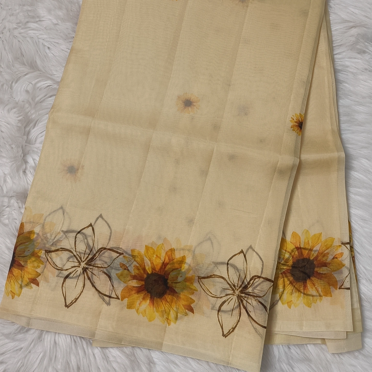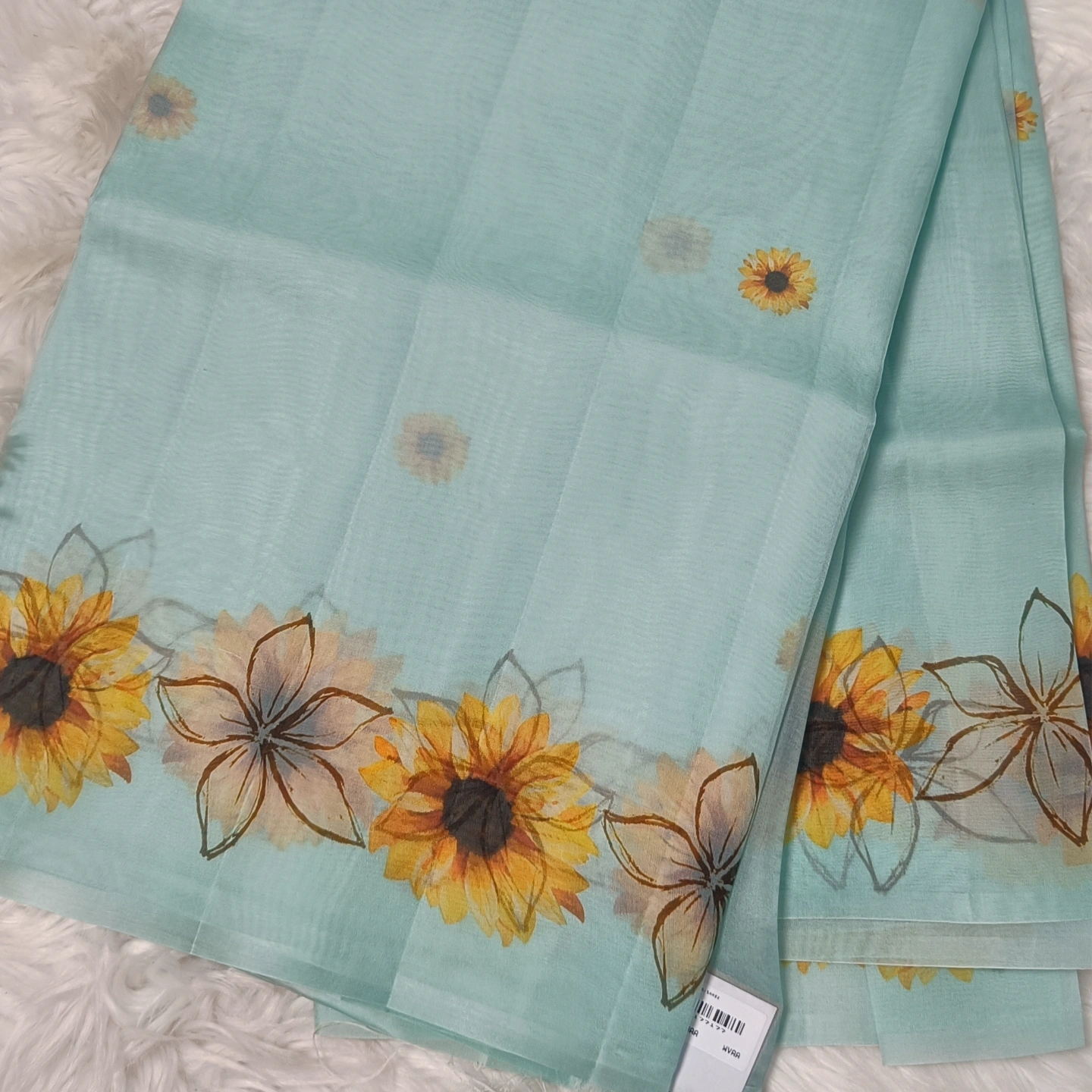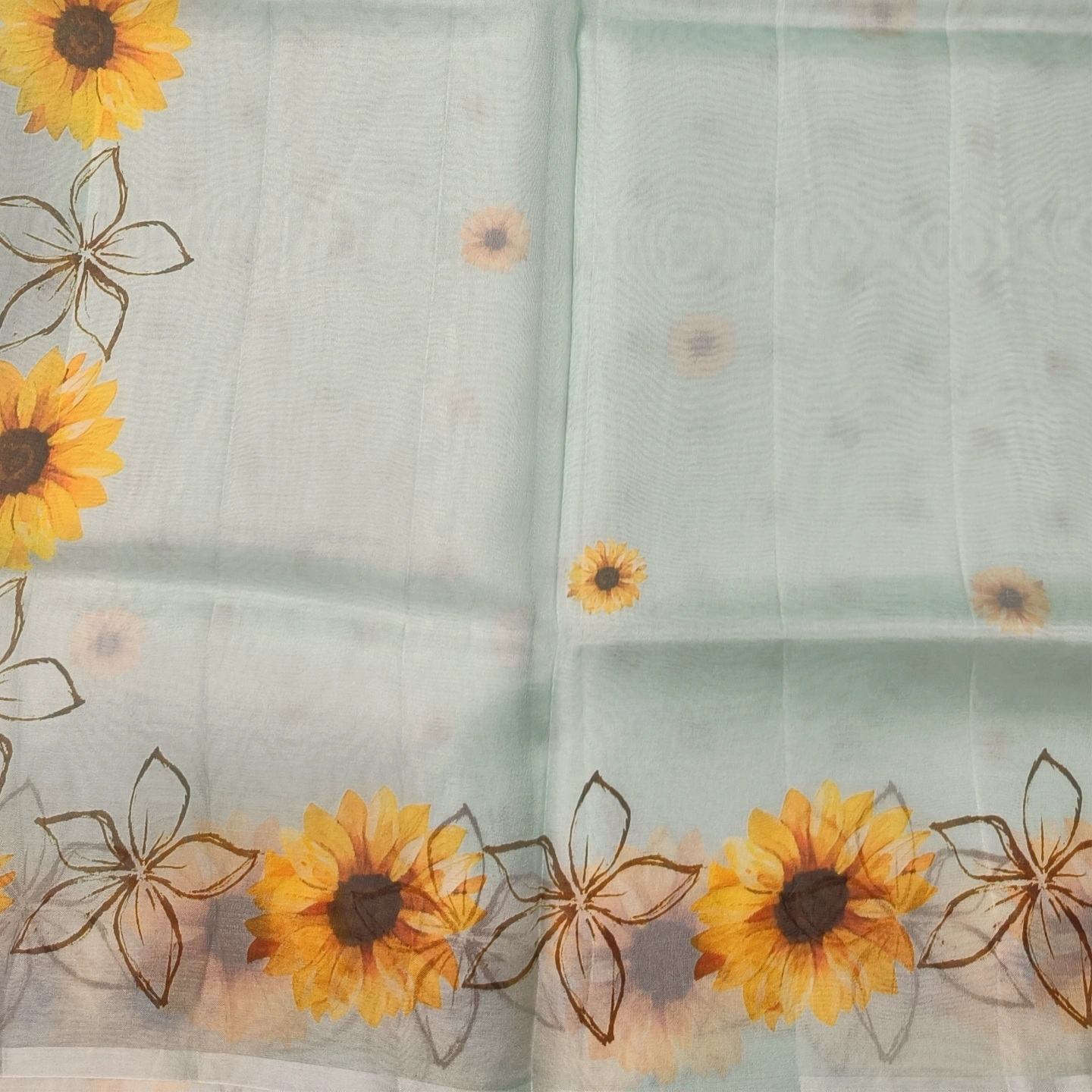 This exquisite saree is crafted from high-quality silk organza, offering a sheer, ethereal texture and a structured drape that exudes effortless elegance. Set against a refreshing seafoam green backdrop, the design features a charming array of sunflower motifs that bring a cheerful, radiant energy to the garment. The border is adorned with a dense row of large, golden-yellow sunflowers interspersed with delicate line-art blooms, while smaller floral accents are scattered across the body for a balanced, airy look. The digital printing ensures every petal and detail is sharp and vibrant, making this piece a perfect choice for festive brunches, daytime weddings, or any occasion that calls for a fresh and graceful aesthetic.