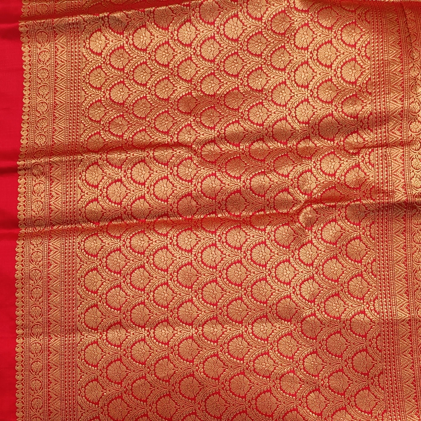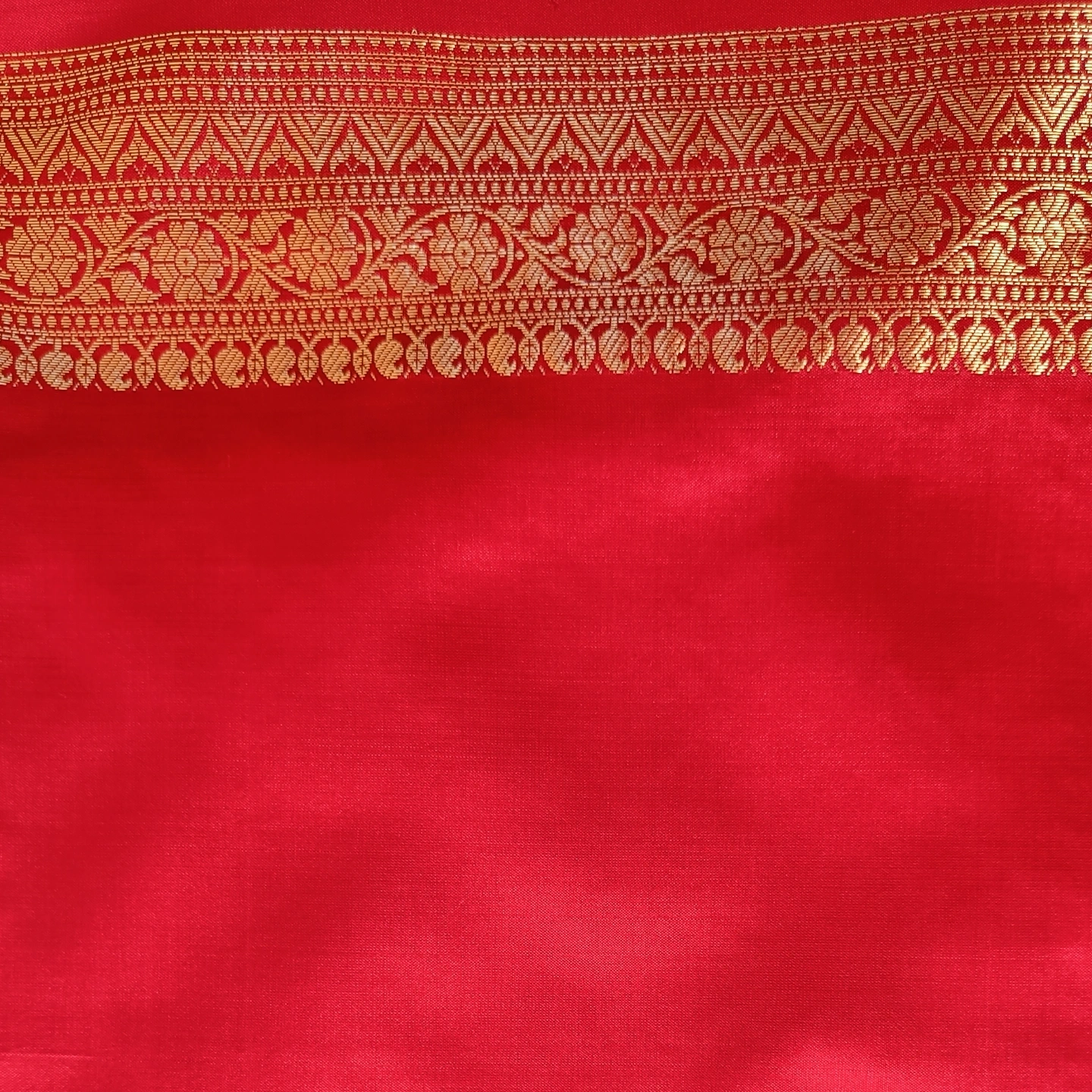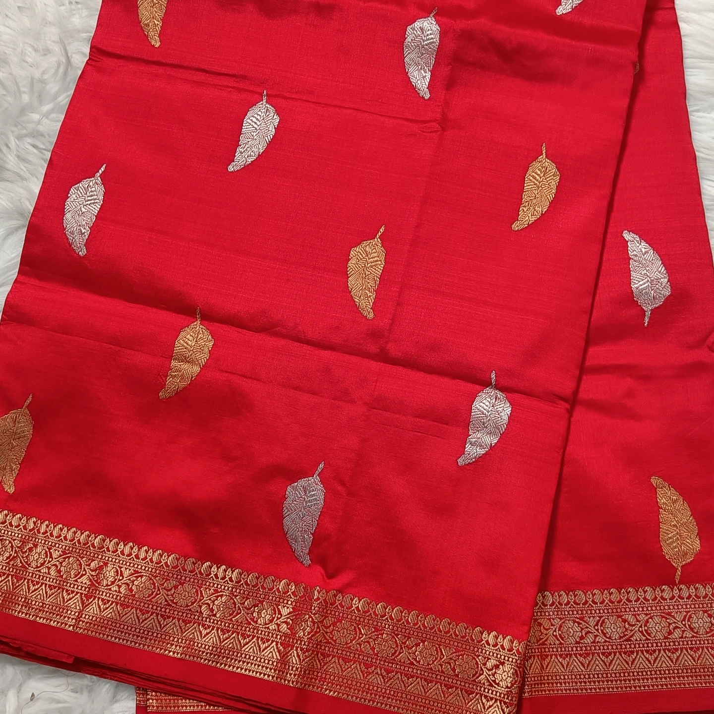 Woven in pure Katan silk, this saree showcases the finesse of traditional kadwa weaving, featuring delicately crafted leaf motifs in sona rupa zari scattered across the body. The smooth, lustrous texture enhances its elegant drape, while the intricately woven border adds a touch of classic richness. A harmonious blend of subtle design and heritage craftsmanship, it is perfect for refined festive and traditional occasions.