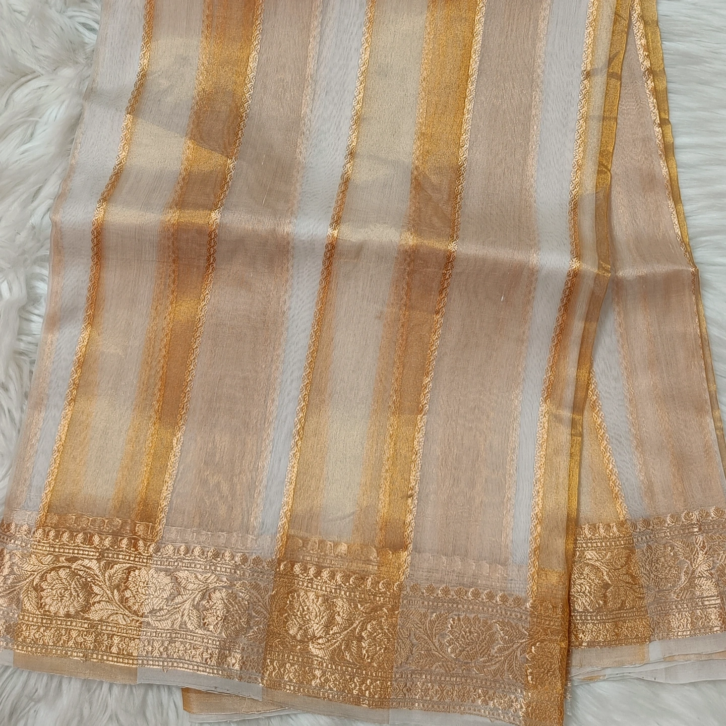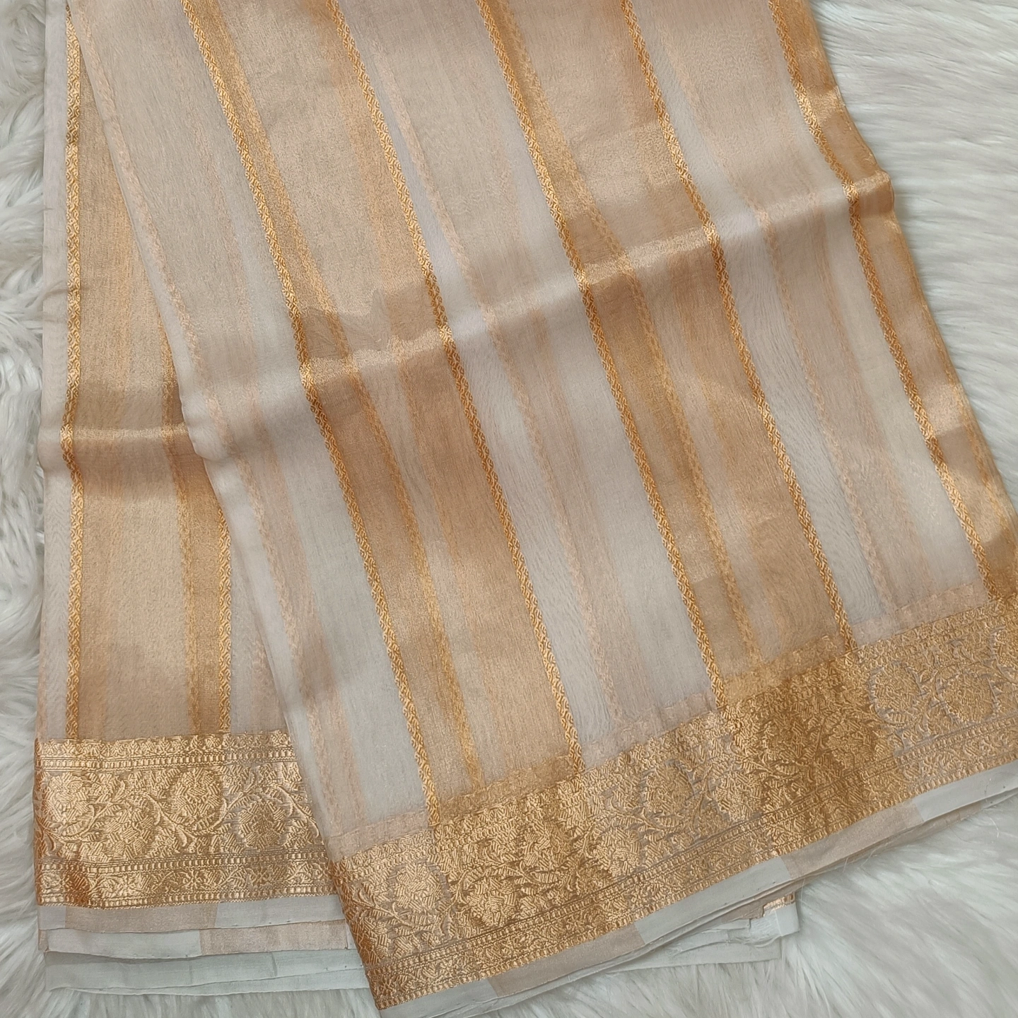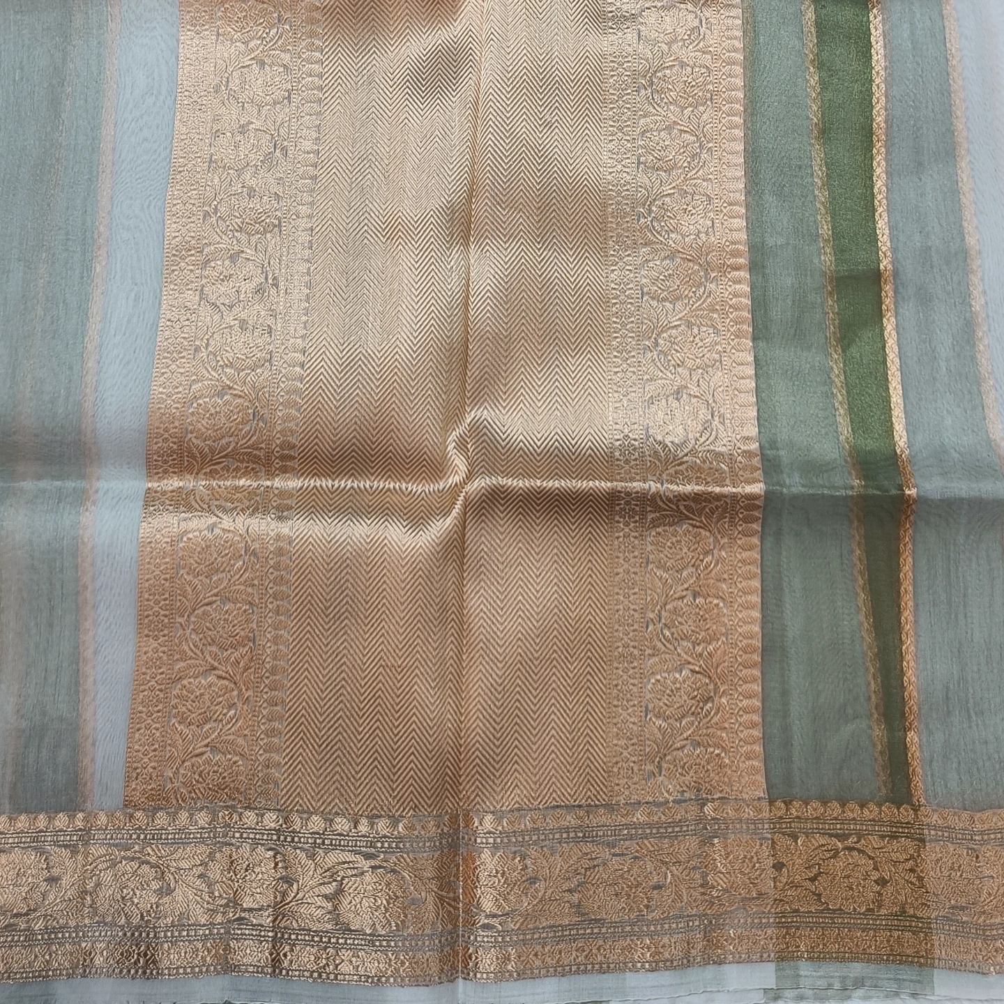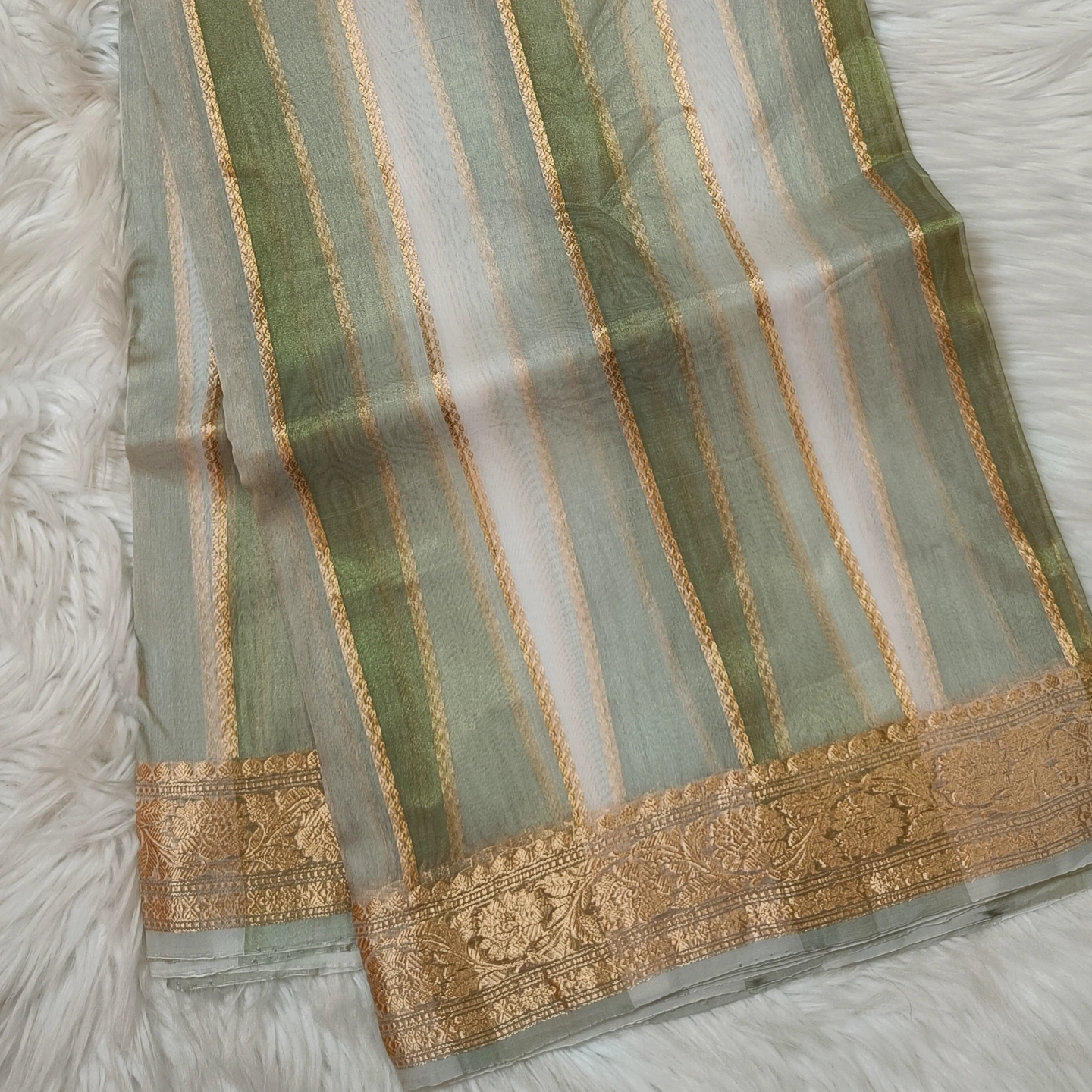 This exquisite fabric offers a masterclass in understated luxury, combining the ethereal shimmer of Tissue Organza with a structured, linear aesthetic. The material is characterized by its lightweight, crisp texture and a subtle metallic sheen that plays beautifully with the light. The design features a sophisticated vertical lining pattern, where alternating stripes of soft olive, sage green, and pristine white create a rhythmic, elongating effect. These stripes are further enhanced by delicate golden zari pinstripes, adding a touch of opulent detail to the modern palette. The composition is grounded by a traditional zari border, intricately woven with classic floral vine motifs in metallic gold. This fusion of contemporary vertical rangkat-style stripes and heritage craftsmanship makes this fabric an exceptional choice for creating refined sarees or avant-garde evening wear that exudes a serene, polished elegance.