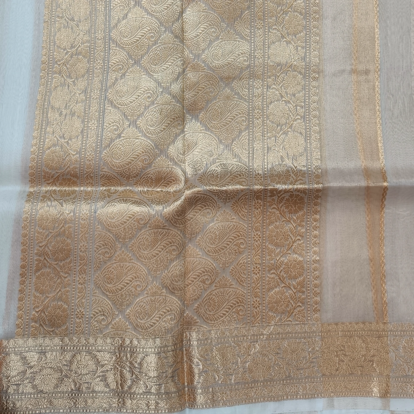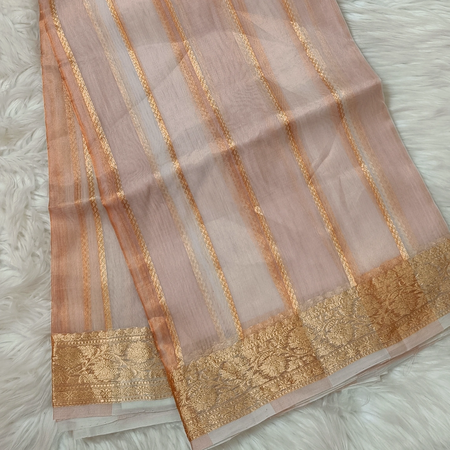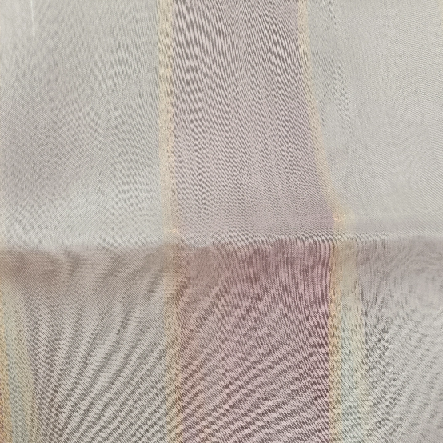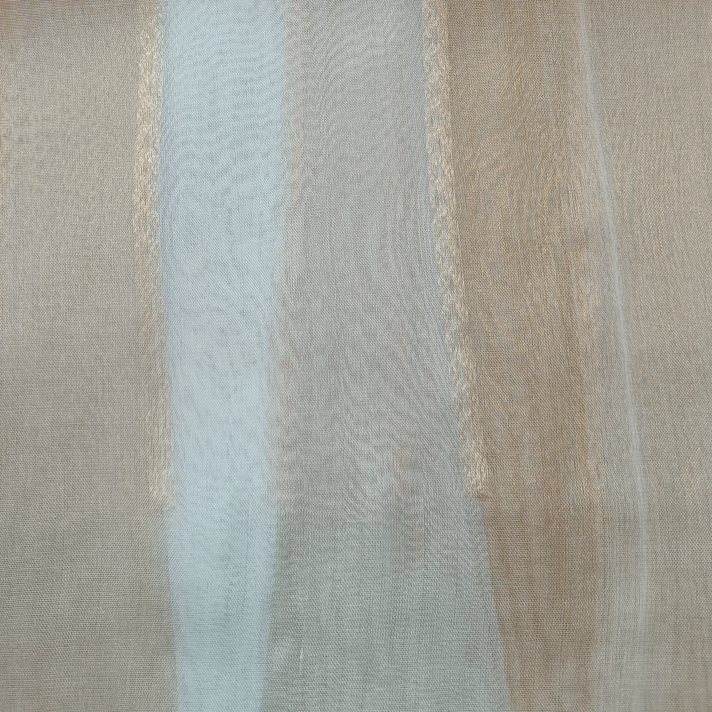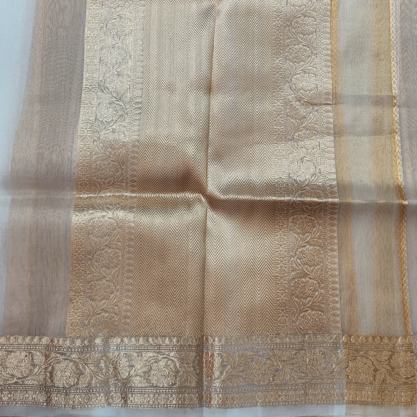 This exquisite fabric offers a masterclass in understated luxury, combining the ethereal shimmer of Tissue Organza with a structured, linear aesthetic. The material is characterized by its lightweight, crisp texture and a subtle metallic sheen that plays beautifully with the light. The design features a sophisticated vertical lining pattern, where alternating stripes of soft olive, sage green, and pristine white create a rhythmic, elongating effect. These stripes are further enhanced by delicate golden zari pinstripes, adding a touch of opulent detail to the modern palette. The composition is grounded by a traditional zari border, intricately woven with classic floral vine motifs in metallic gold. This fusion of contemporary vertical rangkat-style stripes and heritage craftsmanship makes this fabric an exceptional choice for creating refined sarees or avant-garde evening wear that exudes a serene, polished elegance.