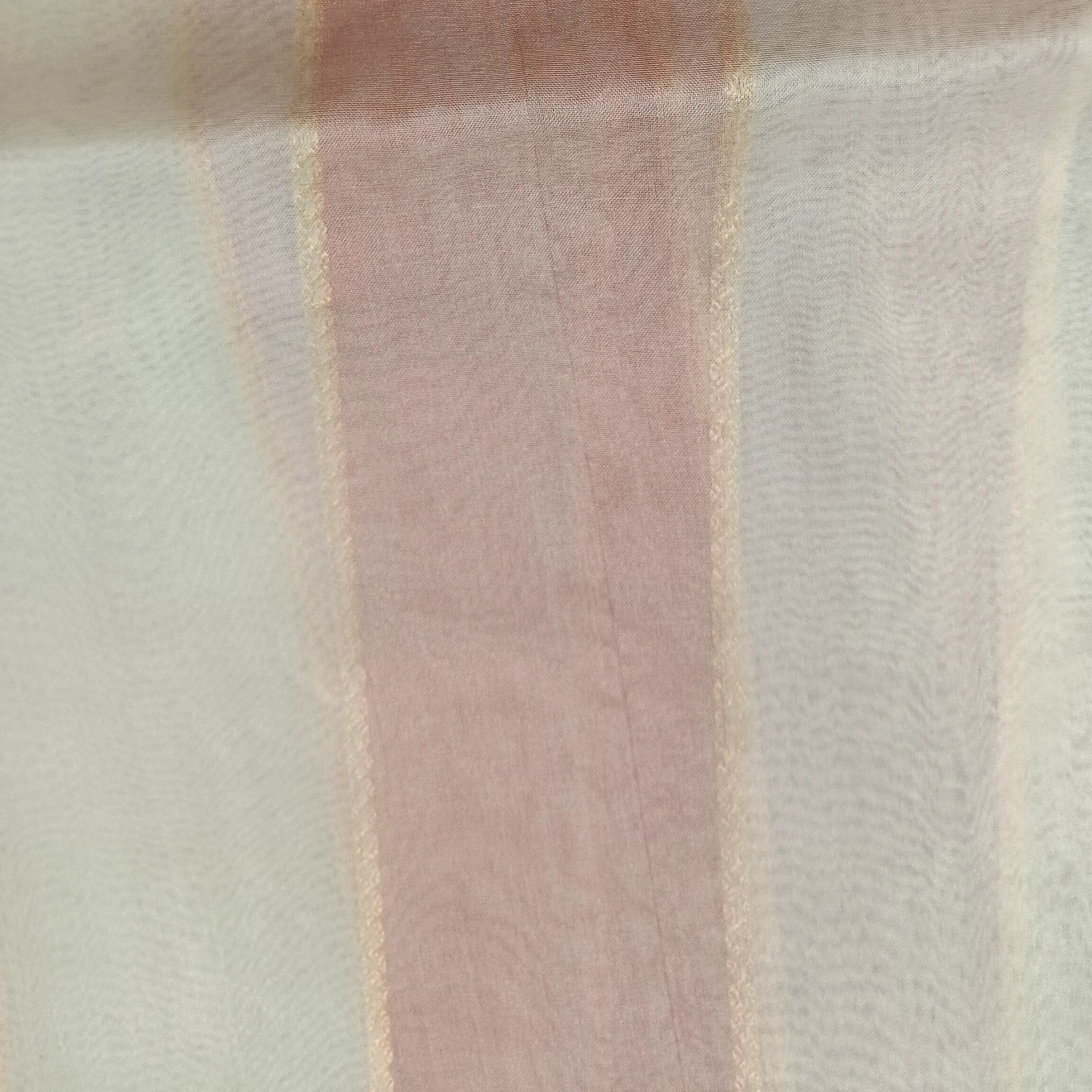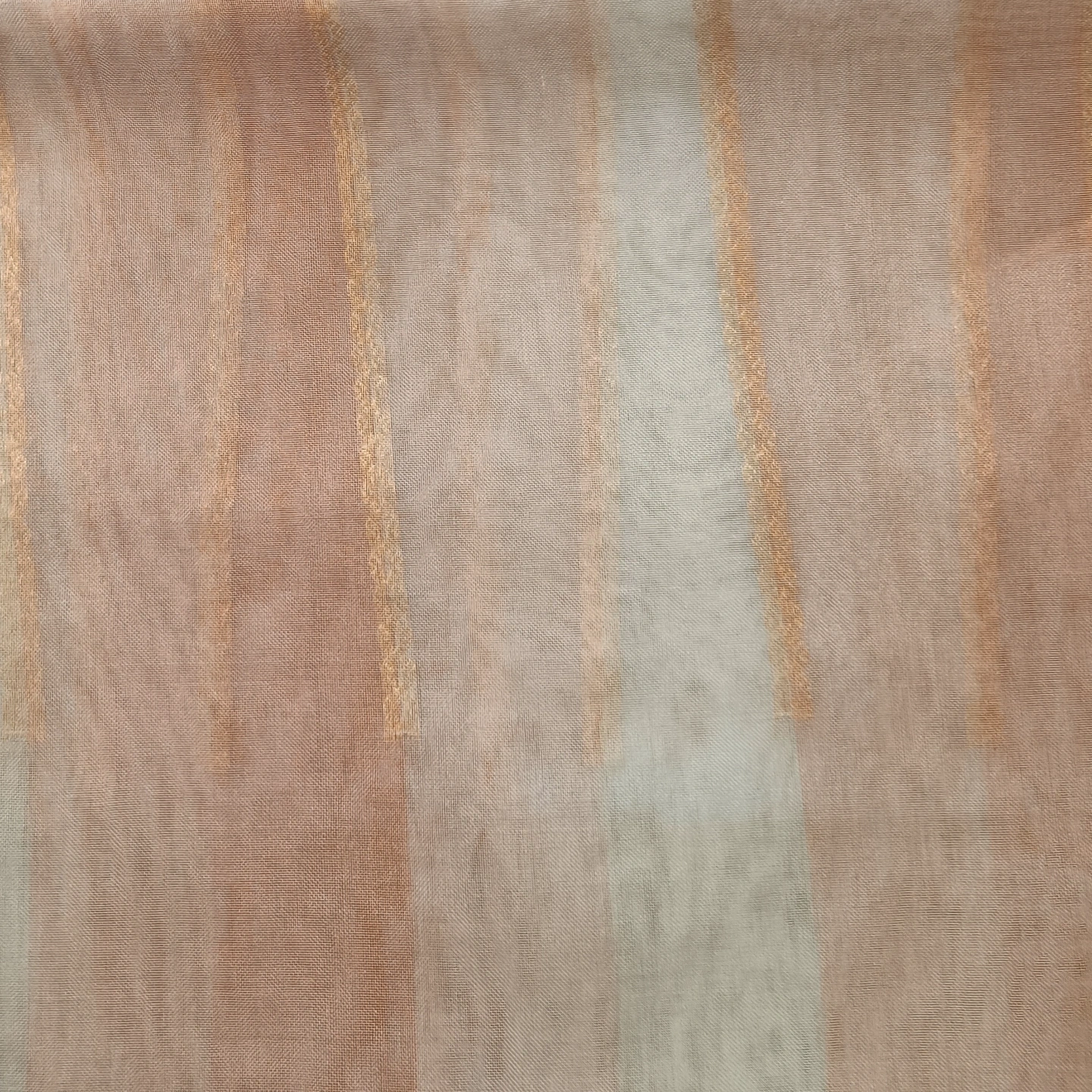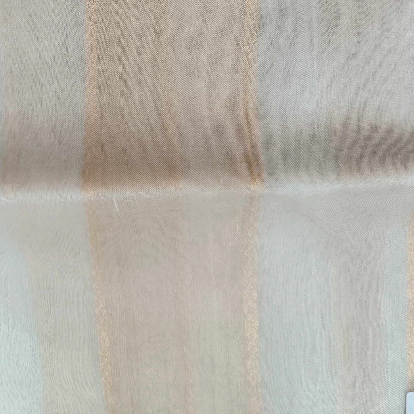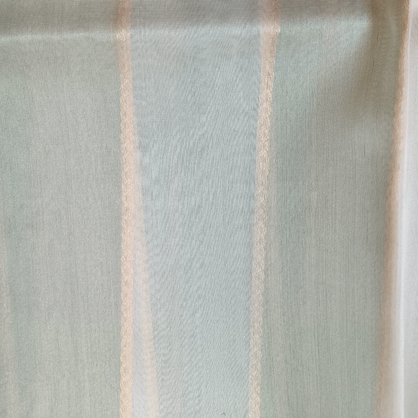 This exquisite fabric offers a masterclass in understated luxury, combining the ethereal shimmer of Tissue Organza with a structured, linear aesthetic. The material is characterized by its lightweight, crisp texture and a subtle metallic sheen that plays beautifully with the light. The design features a sophisticated vertical lining pattern, where alternating stripes of soft olive, sage green, and pristine white create a rhythmic, elongating effect. These stripes are further enhanced by delicate golden zari pinstripes, adding a touch of opulent detail to the modern palette. The composition is grounded by a traditional zari border, intricately woven with classic floral vine motifs in metallic gold. This fusion of contemporary vertical rangkat-style stripes and heritage craftsmanship makes this fabric an exceptional choice for creating refined sarees or avant-garde evening wear that exudes a serene, polished elegance.