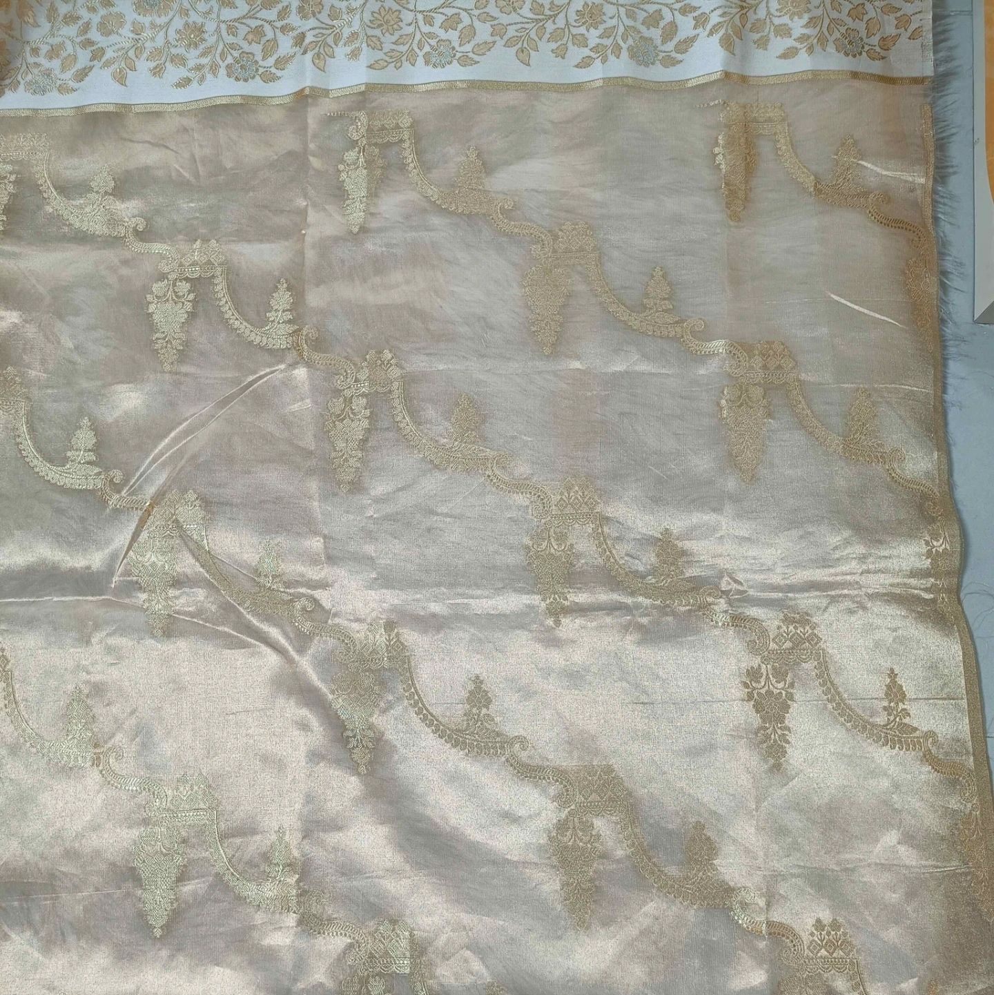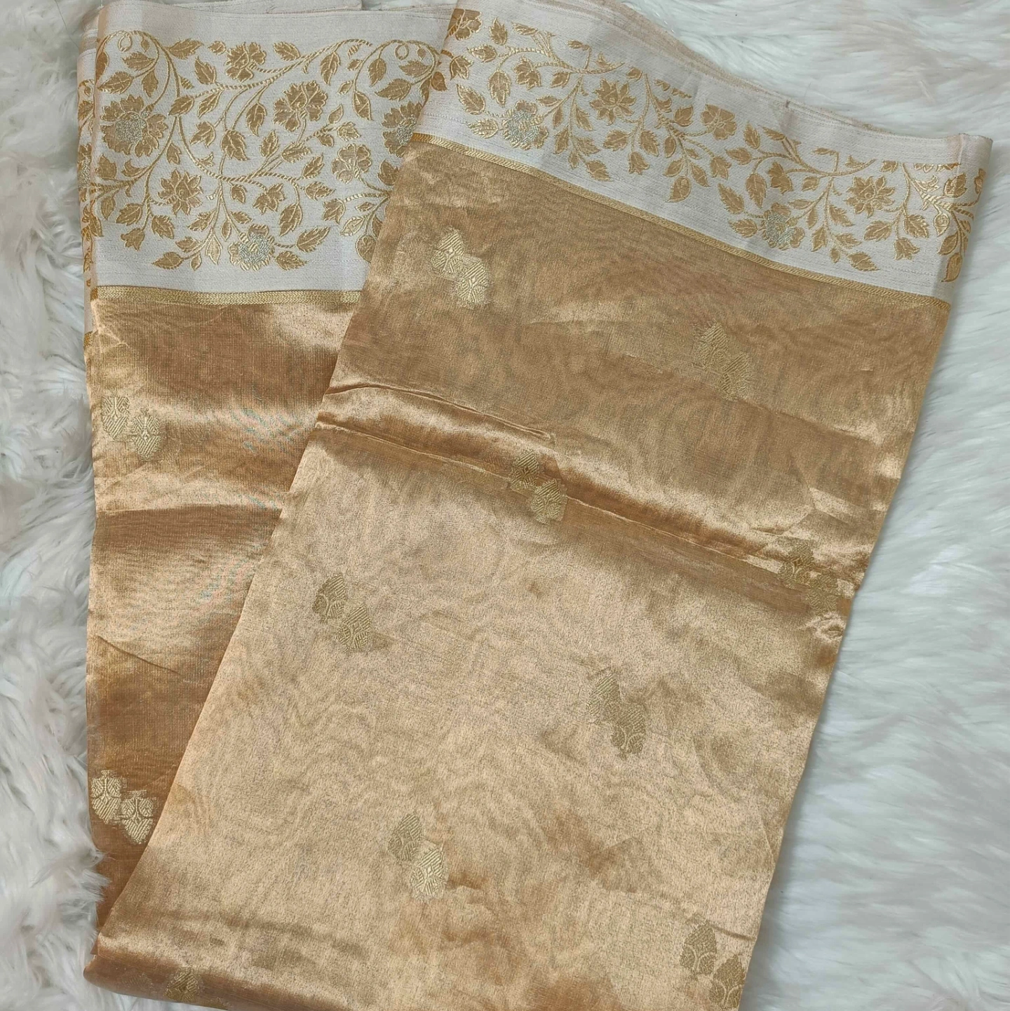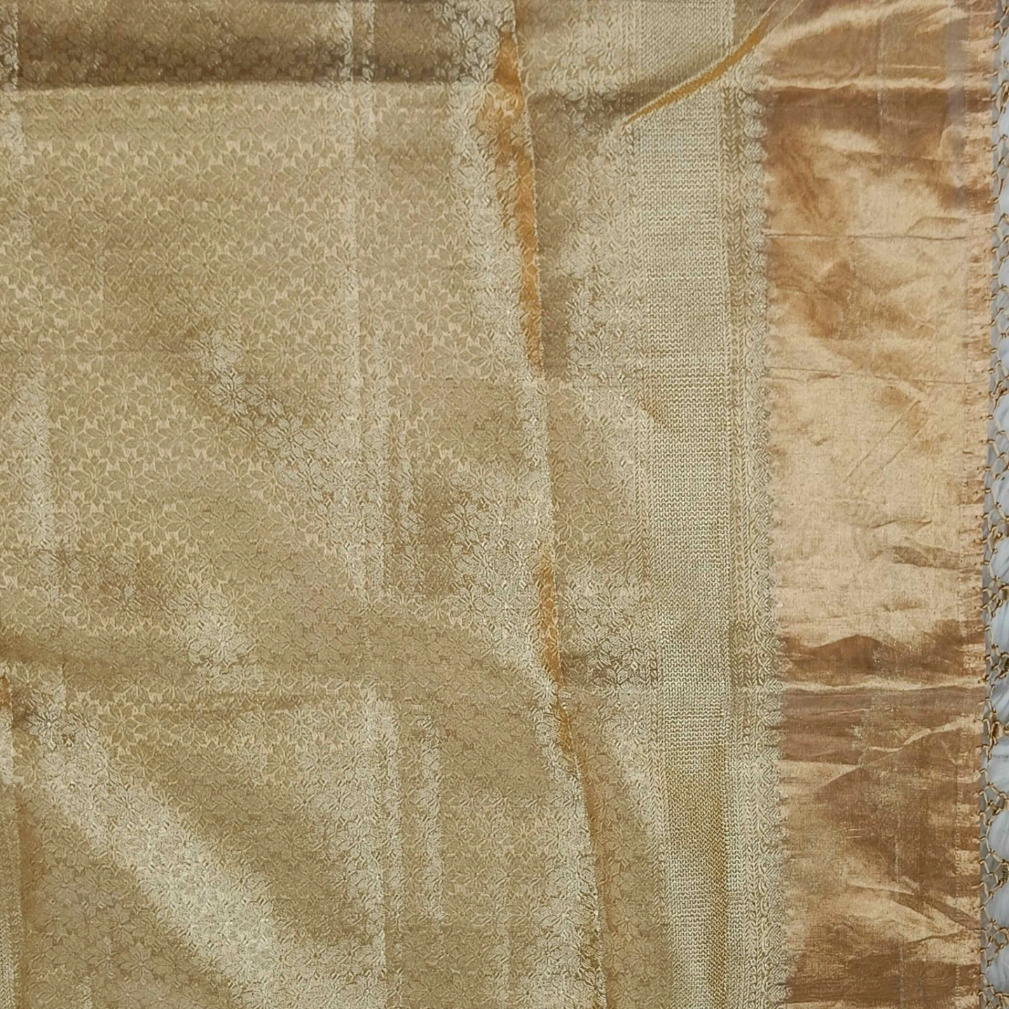 Crafted from lustrous tissue zari, this saree exudes a radiant sheen with a lightweight, graceful drape. The body is adorned with subtle woven motifs that add depth without overpowering its elegance. A delicately detailed floral border enhances its refined appeal, bringing in a touch of intricate craftsmanship. Soft yet structured, this piece is a timeless expression of understated luxury, perfect for occasions that call for effortless sophistication.
